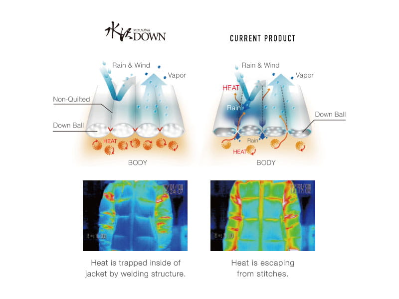 The starting point for it all was the overwhelming desire to create a unique, highly technical down jacket fundamentally different in concept from any that had ever existed before, utilising all the resources of Descente’s very capable designers and craftsmen. In all down jackets prior to this time, the technical focus had tended to narrow down to two main issues – lightness and the quality of the down itself (the so called “fill power”). Starting in 2007, however, Descente opted for a whole new approach, starting with a very hard look at what wearers thought were their weak, or problem points. And they were very soon obvious. Firstly, they performed poorly in rain or snowy conditions, with moisture easily penetrating through the holes made by machine stitched seams, and when the down became wet, it lost heat rather than retained it. Furthermore, feathers tended to work themselves out and protrude through holes in the stitching.