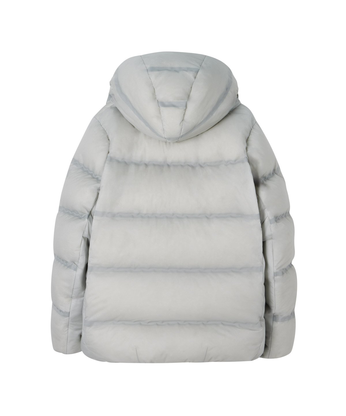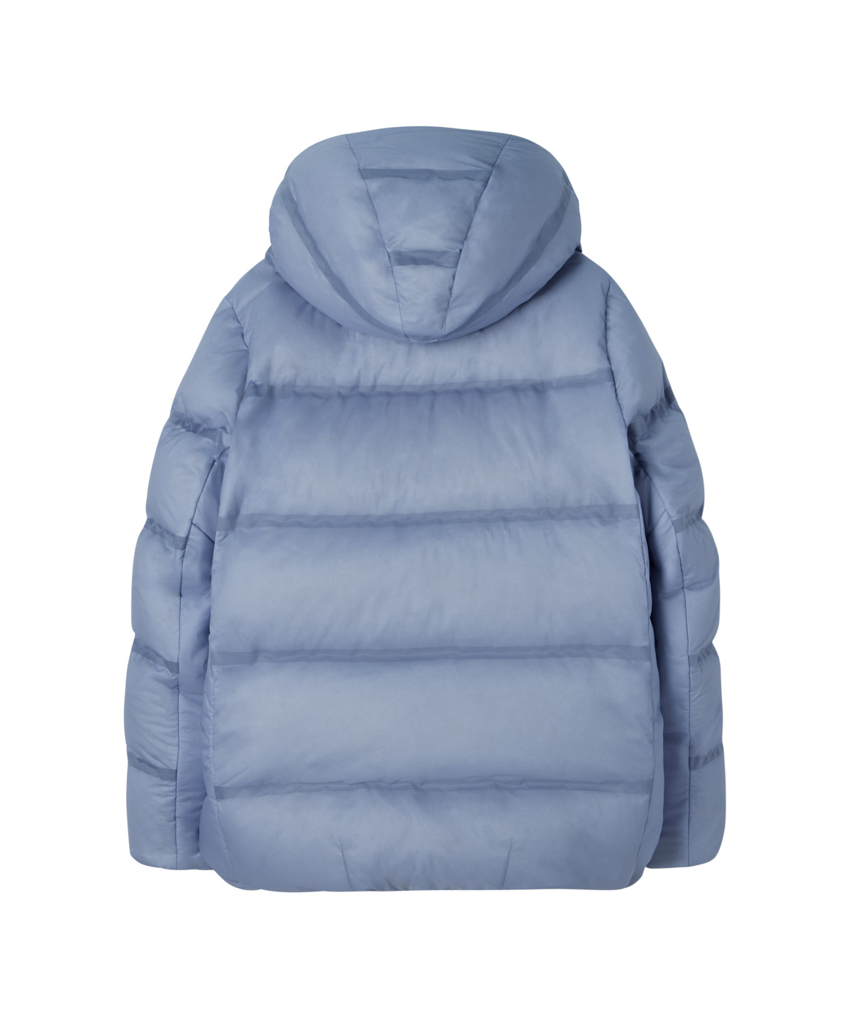 水沢ダウンの、内側の設計までこだわり抜いた美しさを表現するため、12デニールの薄くて軽い、透け感のある表地を選定。透けても黒点が比較的少なく、綺麗に見える羽毛を採用。随一の軽量性と嵩高性を発揮する1000FPのダウンを充填。