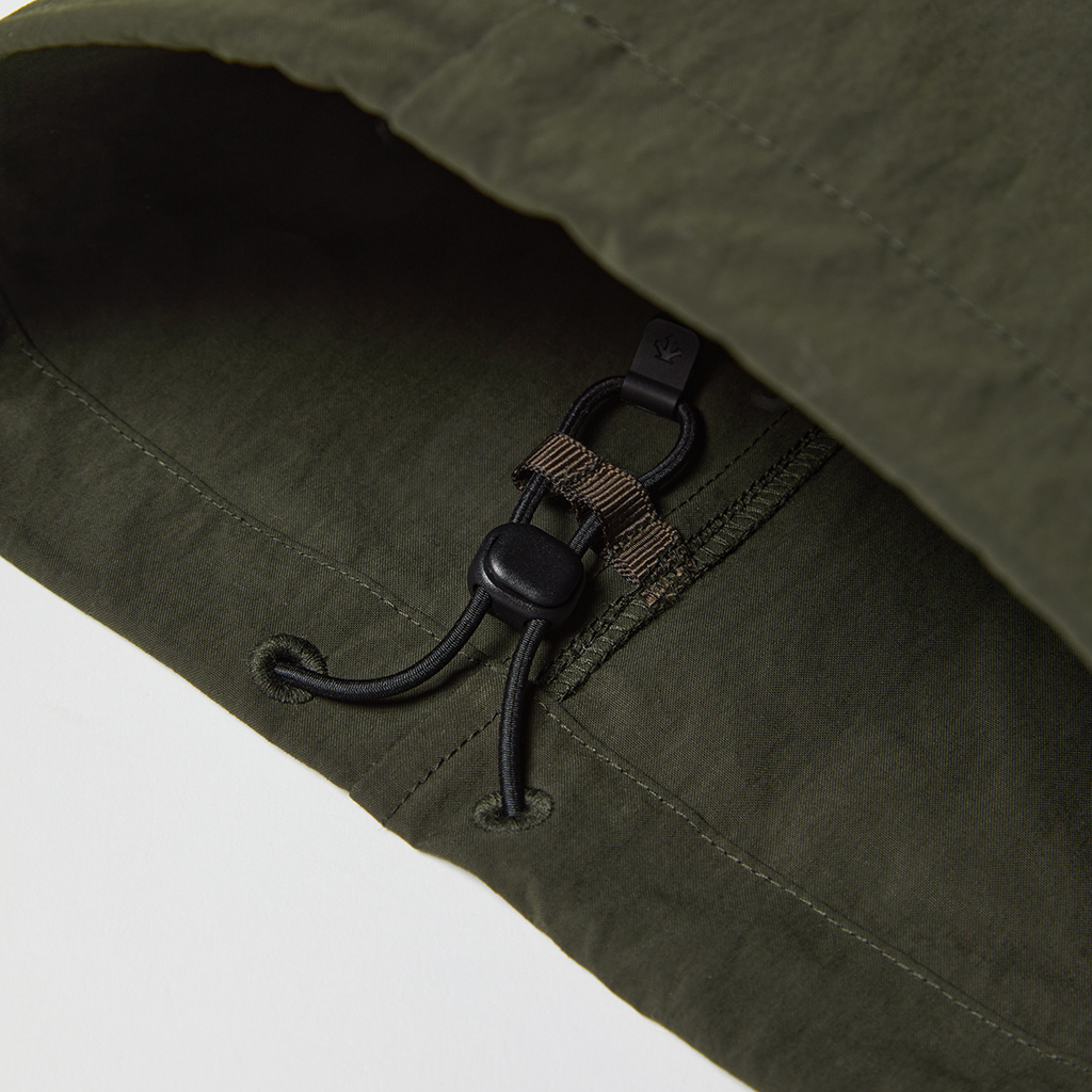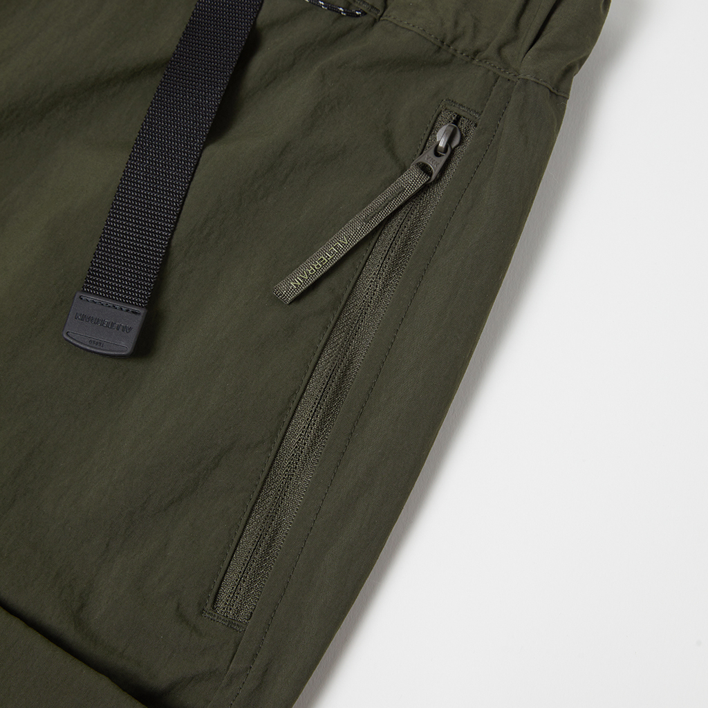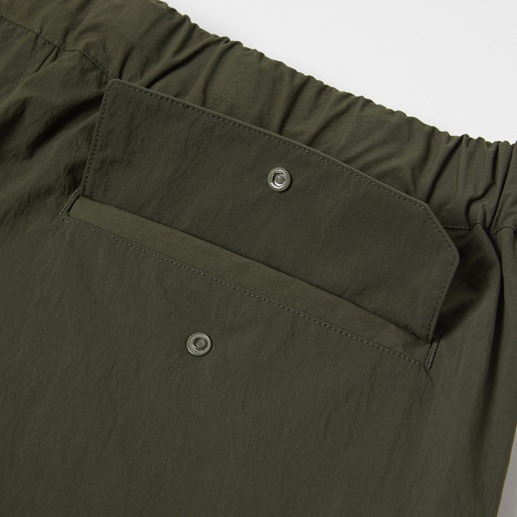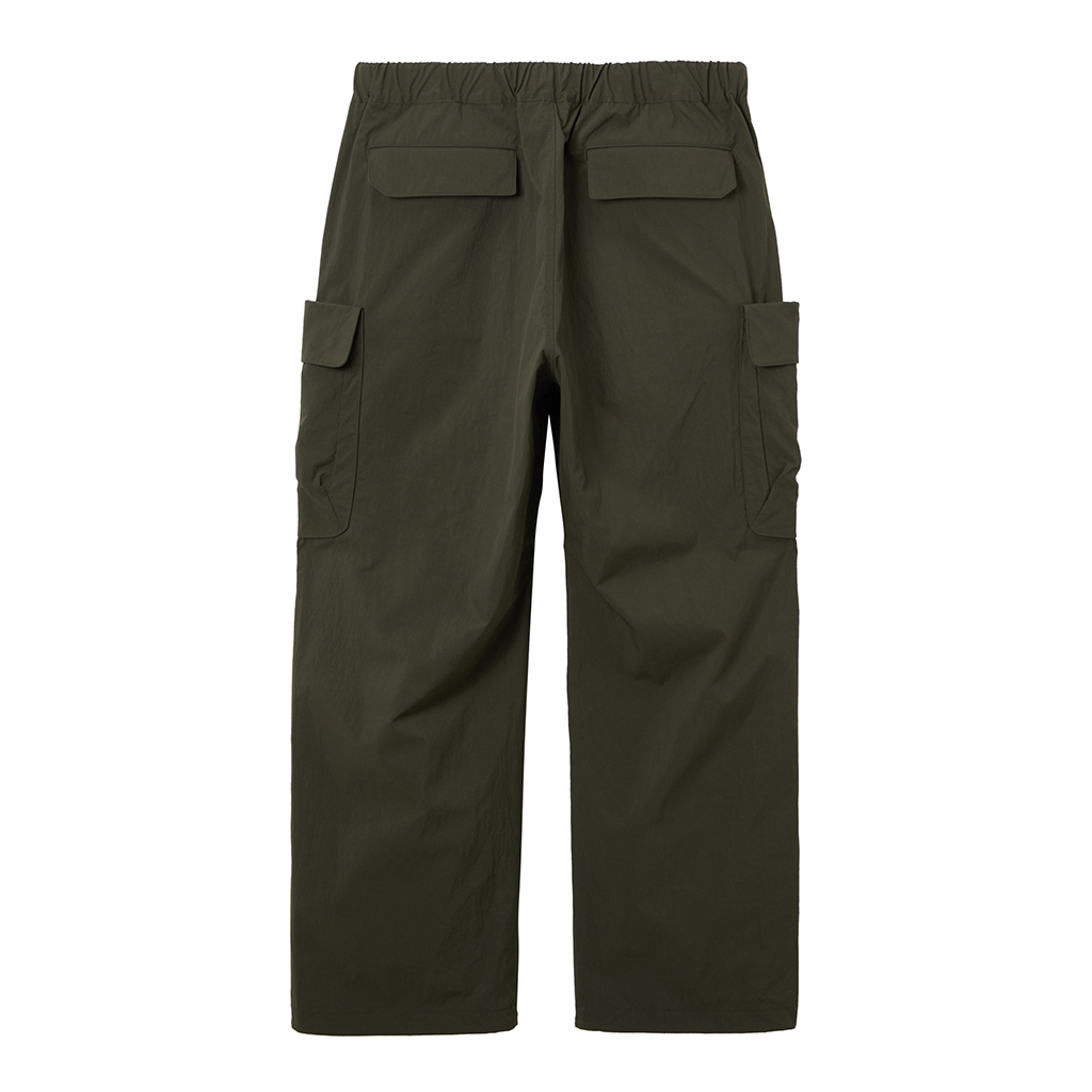Wide cargo pants in Taslan nylon. Water repellency is achieved with a CO treatment, free from decomposition-resistant fluorine compounds. They offer excellent storage with zippered side pockets, snap-button back pockets with flaps and two large thigh pockets with dual compartments. The front closes with a button-and-zipper and a waist belt allows easy adjustment. The legs can be narrowed with rubber spindles and stoppers at the bottom hems. Suitable for a wide range of outdoor activities and everyday wear.