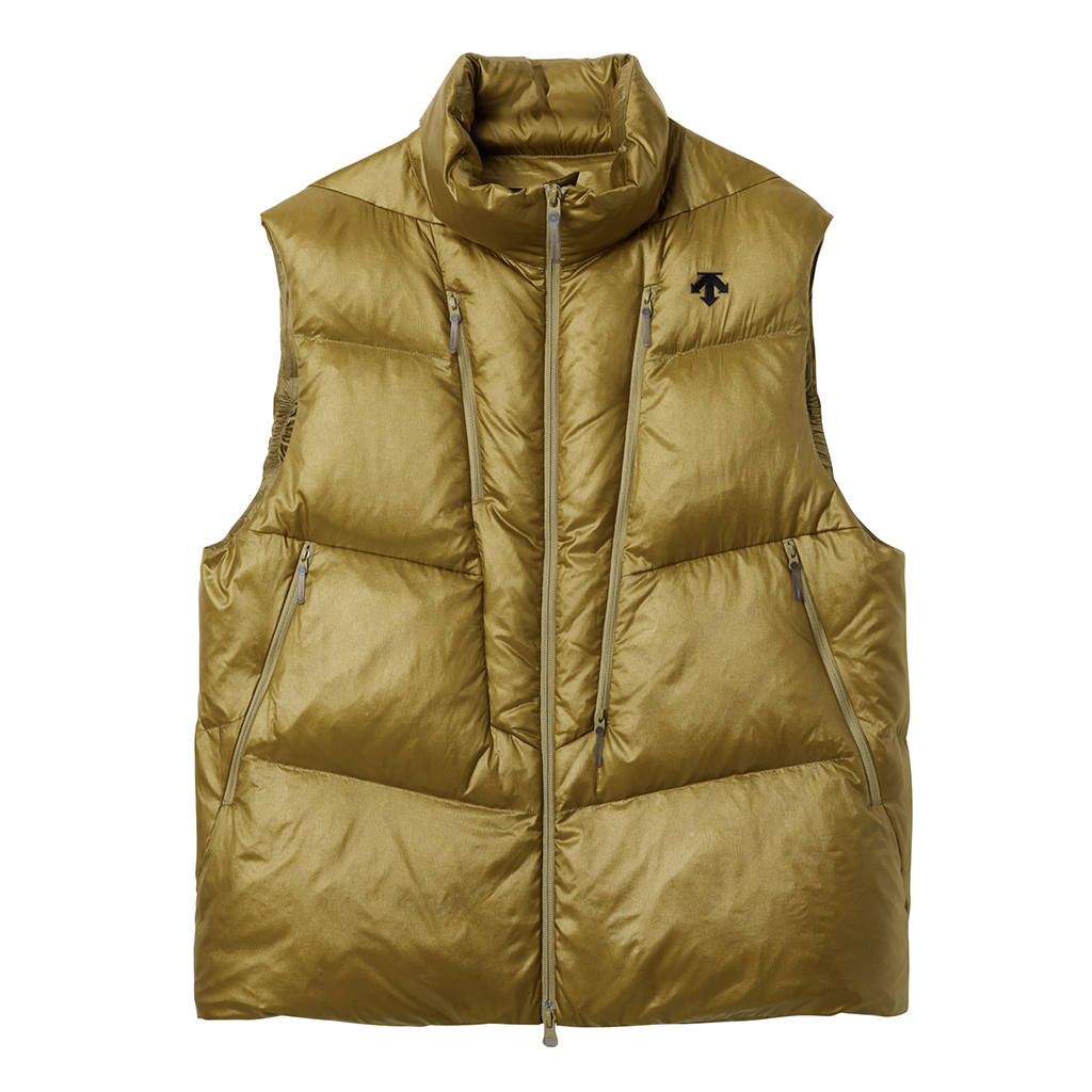 A down vest in a lightweight, supple, textured fabric insulated with water repellent 750 fill power down. The front closure has a full-length zipper, and there are four zippered pockets on the left and right front. Of these, the larger left chest pocket has additional compartments inside. Rubber spindles and stoppers at the hem make adjustment easy. It comes with a stuff sack for portability. Suitable for extreme cold-weather conditions and a wide range of outdoor activities.