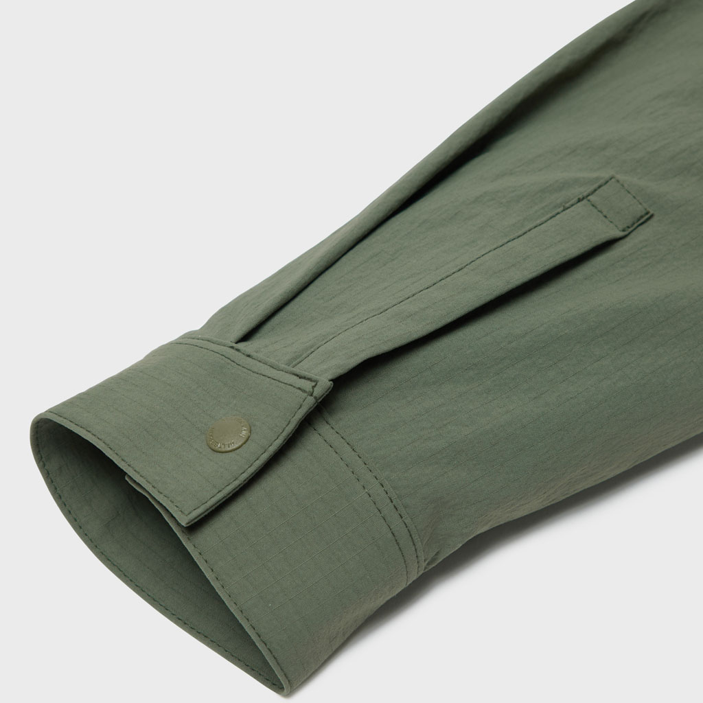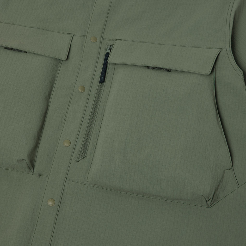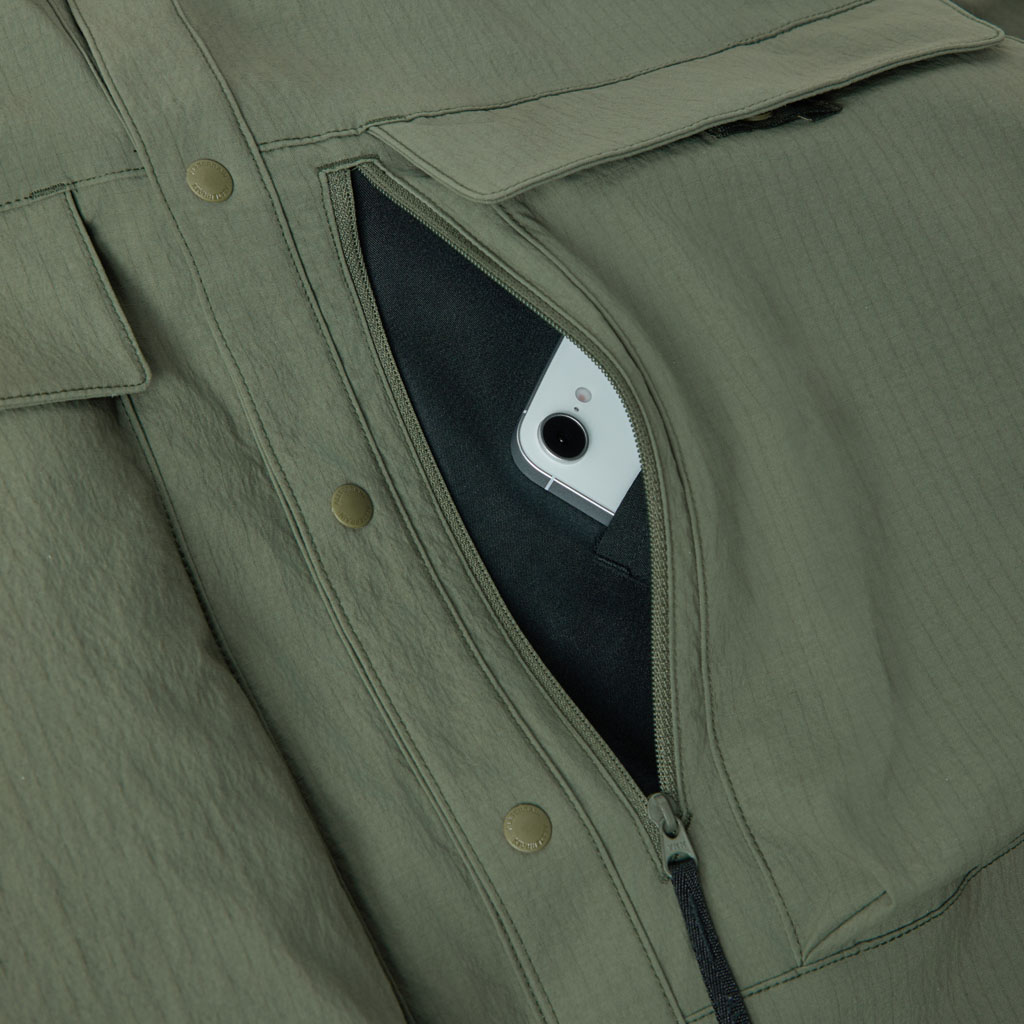 Crafted from durable CORDURA(R) fabric developed by DuPont, this long sleeve shirt offers excellent stretch to follow a wide range of movement, along with waterrepellent functionality that resists light rain. The waterrepellent finish is C0based, free from fluorochemicals that are resistant to environmental degradation, making it an ecoconscious choice.The front features snapbutton closures for easy on and off. Five pockets are positioned across the front for enhanced storage capacity. The large zippered pocket on the left side includes an internal compartment for organized storage.Side slits at the hem improve comfort and mobility during dynamic movements. With a slightly relaxed silhouette, this versatile shirt transitions seamlessly from outdoor activity to everyday wear.