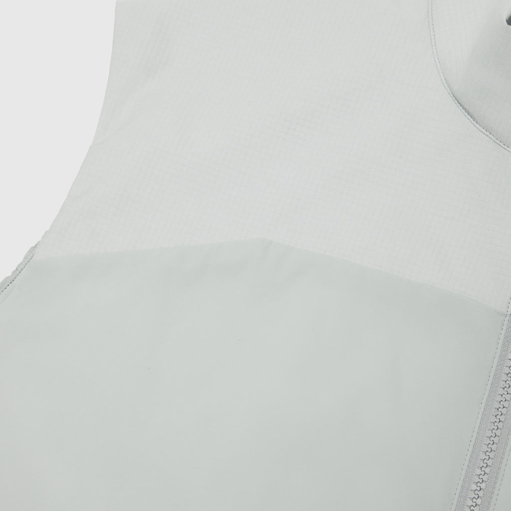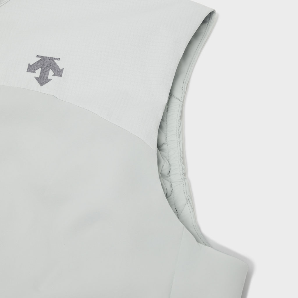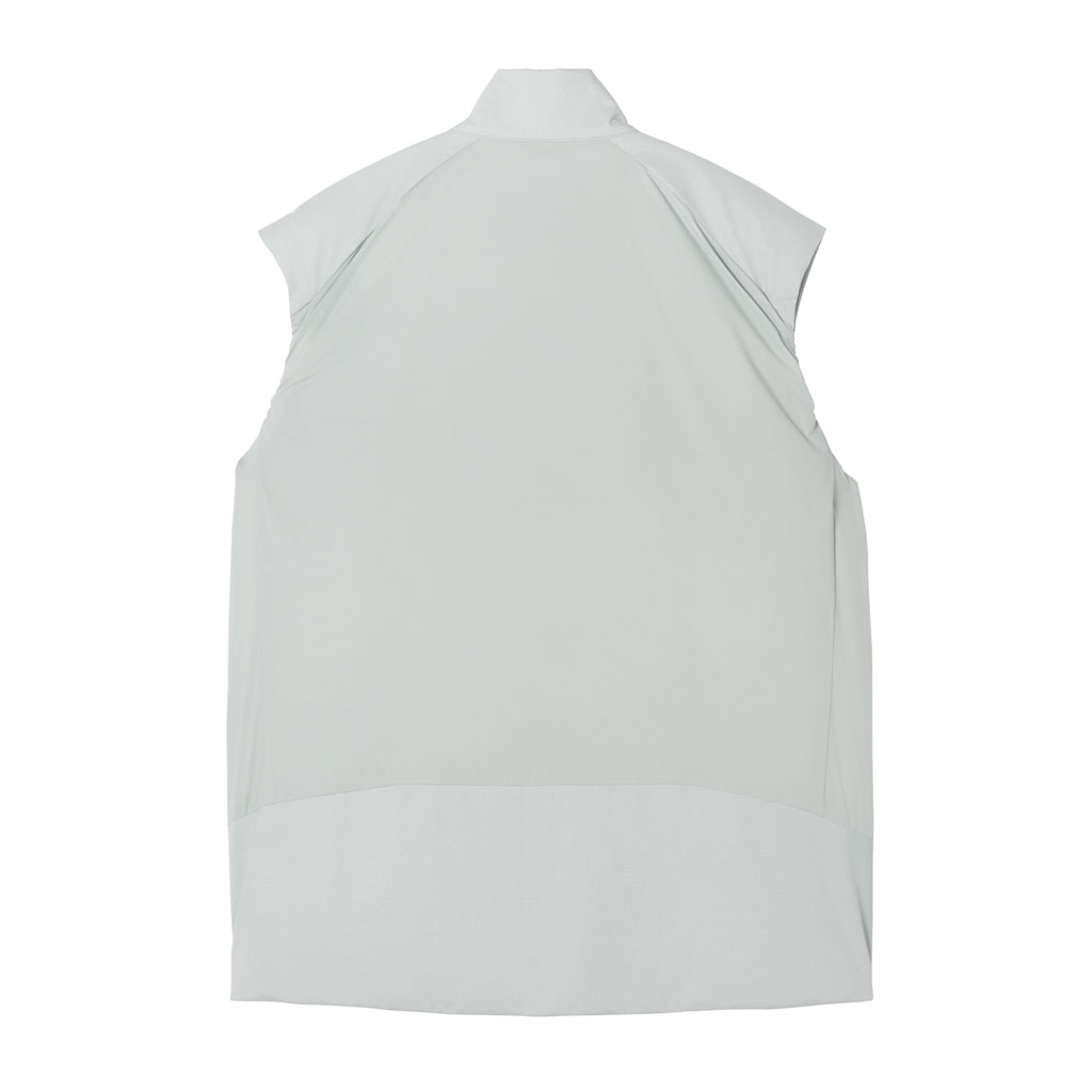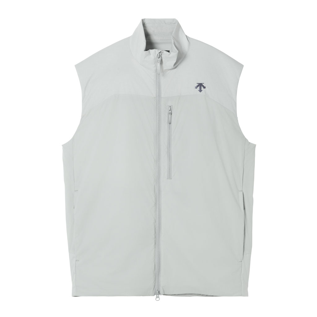 A lightweight insulated vest in supple nylon using DTY (Draw Textured Yarn), a specialty of Japan’s Hokuriku region. The insulation is 3DeFX(R), an advanced material with multiple intricately intertwined 3D spiral fibers that offers superior loft, warmth, stretch and breathability. The shoulders, where backpack harnesses tend to cause friction, are reinforced with a waterresistant twolayer ripstop shell fabric. The waterrepellent finish uses ecofriendly C0 technology, free of fluorinated compounds. It has three zippered pockets: two at the sides and one on the left chest, which doubles as a selfpacking pouch for portability. Versatile enough for both outdoor activities and everyday active wear.
