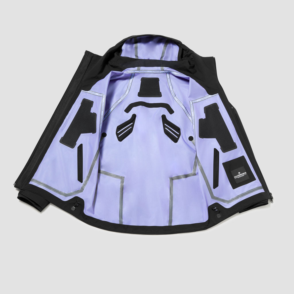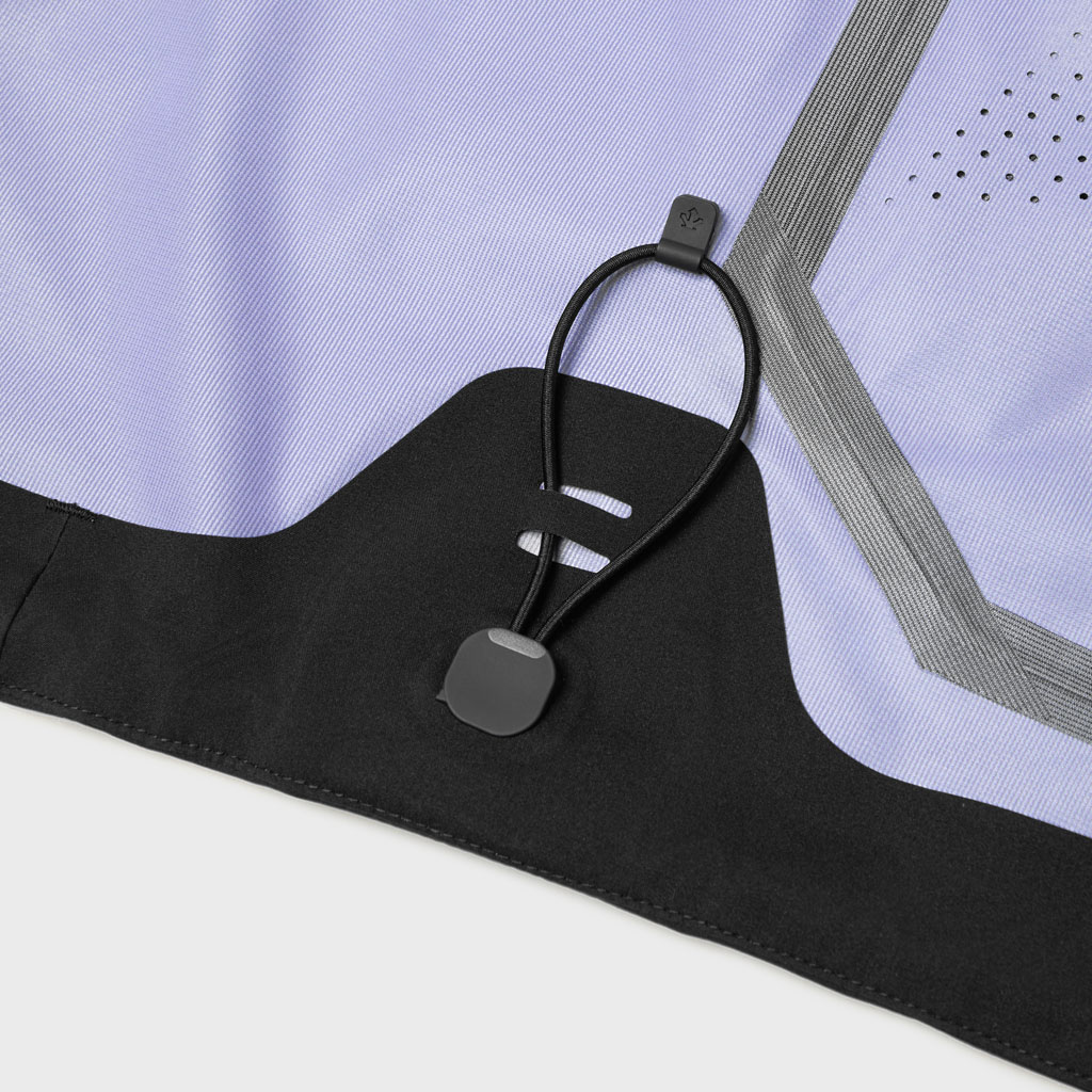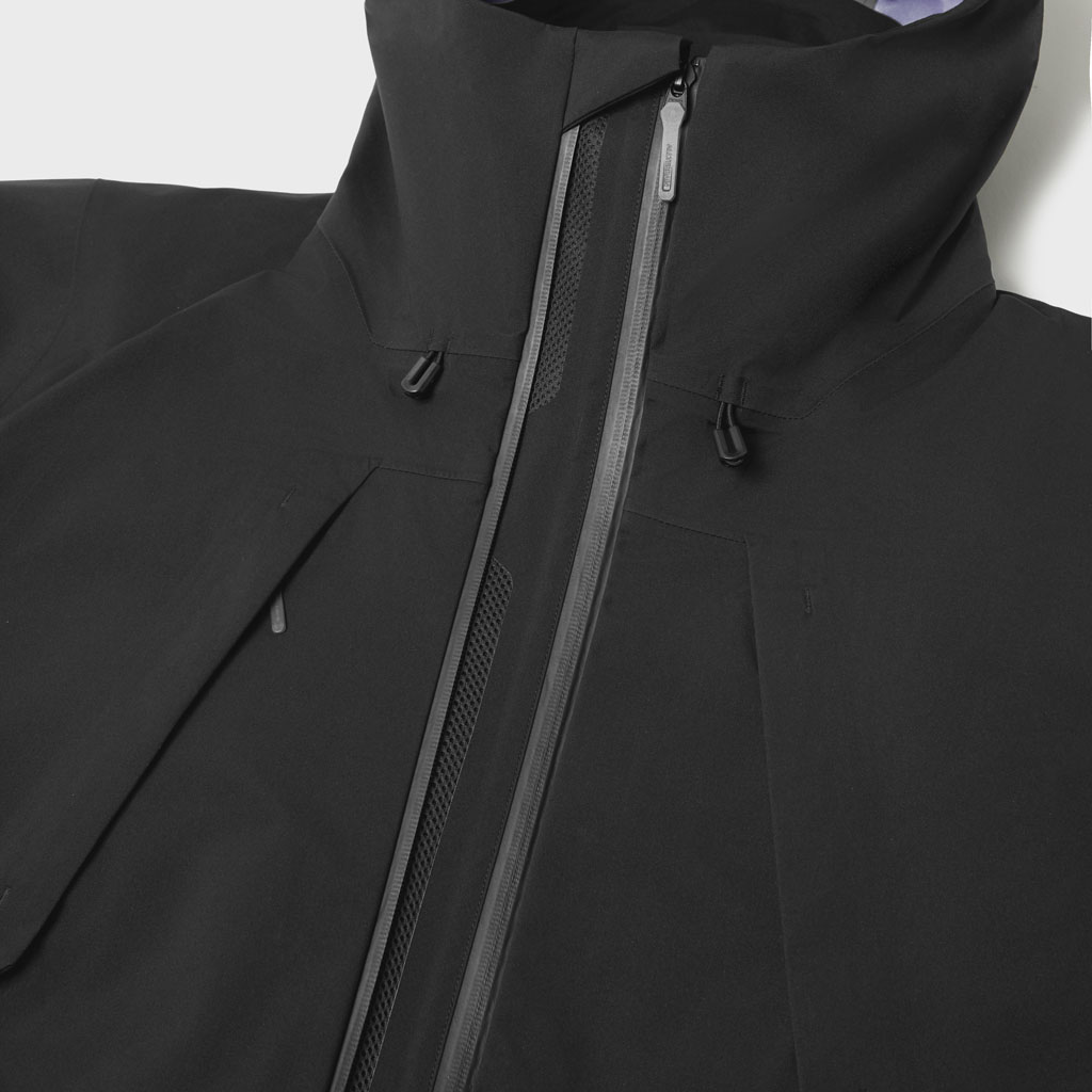 A shell jacket in waterproof, windproof and breathable 3L Dermizax(R). The tricot lining has been customdyed purple for visual appeal. It features Descente’s unique Dual Ventilation System with double raschel mesh between two parallel zippers to regulate internal temperature by allowing outside air in. The front has four zippered pockets with strategically placed double raschel mesh and lasercut holes to enhance breathability. On the back, laser vents and 3D spacer parts help air circulate and maintain comfort, especially when wearing a backpack. The hood is equipped with drawcords and stoppers. The cuffs have a onehand adjustment feature, allowing easy adjustment, even with gloves on. The hem is equipped with a Cohaesive TM cord lock system, for quicker and easier size adjustment than before. A brushed tricot lining inside the collar enhances comfort. The gusset pattern design from the underarms to the sleeves prevents the hem from riding up when arms are raised, offering greater comfort during physical activities. Equipped for allseason performance, from the city to the outdoors.