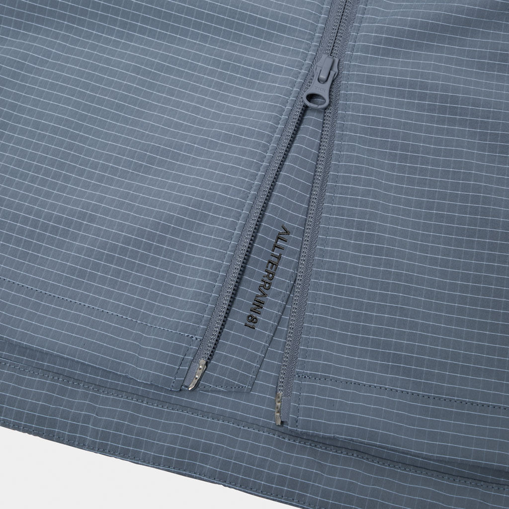 A fullzip jacket in a distinctive ripstop fabric that changes appearance with light and angles. Alternating thick and thin warp yarns (40D filament and 160D Taslan) are used to create surface texture, while weft yarns resist dyeing and reflect light for a rich, multidimensional look. The front has a seamless, origamiinspired three piece VZ (ventilation) structure, blending aesthetics and airflow. The left chest pocket opens from the bottom to reveal a mesh patch pocket and a welt pocket with a key hook ? fusing utility with modern design to bring a new rhythm to everyday movements. This parka brings out the uniqueness of the fabric, showcasing its appeal through both appearance and functionality.