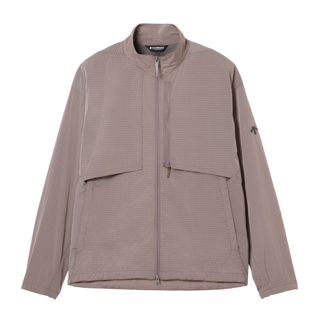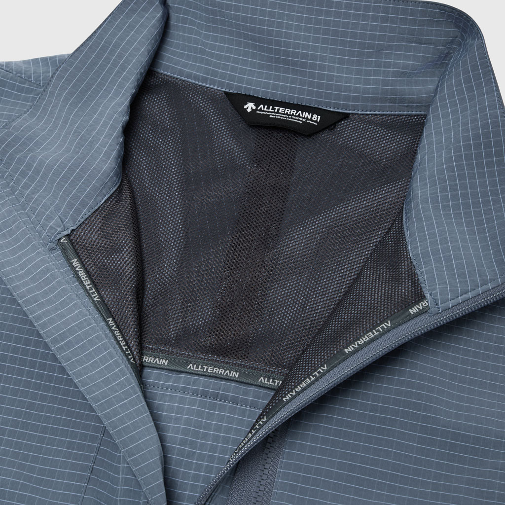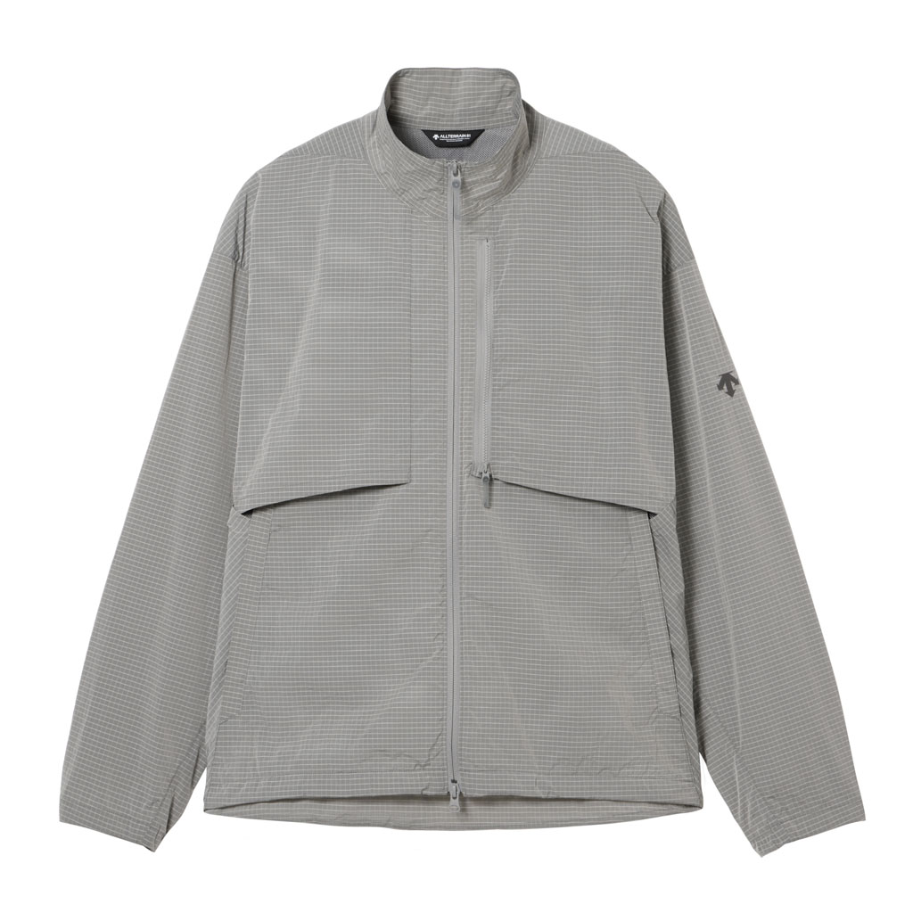 A fullzip jacket in a distinctive ripstop fabric that changes appearance with light and angles. Alternating thick and thin warp yarns (40D filament and 160D Taslan) are used to create surface texture, while weft yarns resist dyeing and reflect light for a rich, multidimensional look. The front has a seamless, origamiinspired three piece VZ (ventilation) structure, blending aesthetics and airflow. The left chest pocket opens from the bottom to reveal a mesh patch pocket and a welt pocket with a key hook ? fusing utility with modern design to bring a new rhythm to everyday movements. This parka brings out the uniqueness of the fabric, showcasing its appeal through both appearance and functionality.