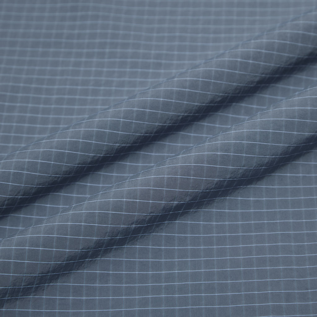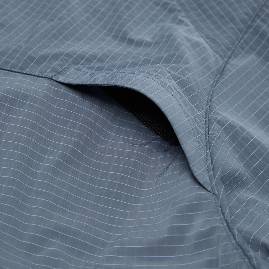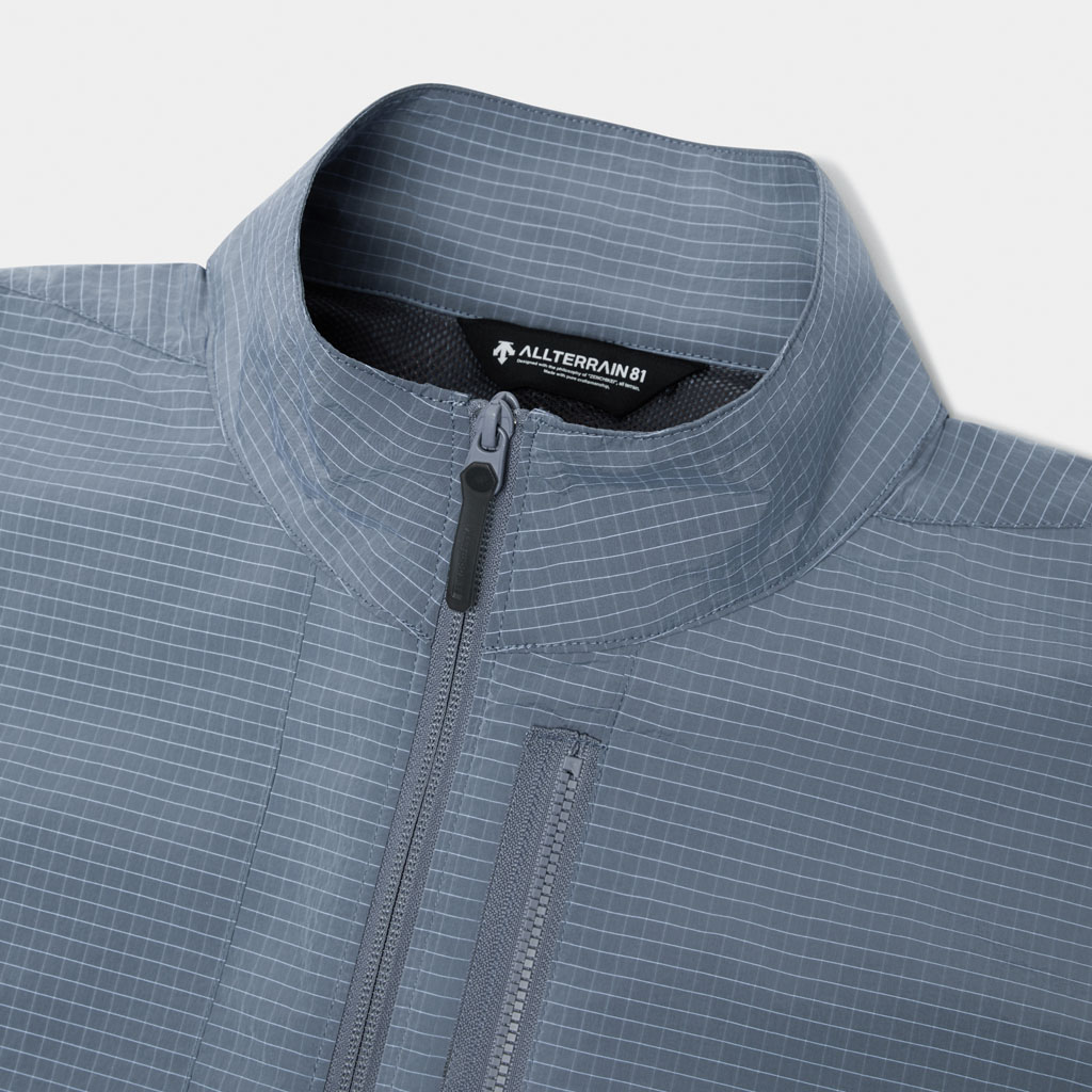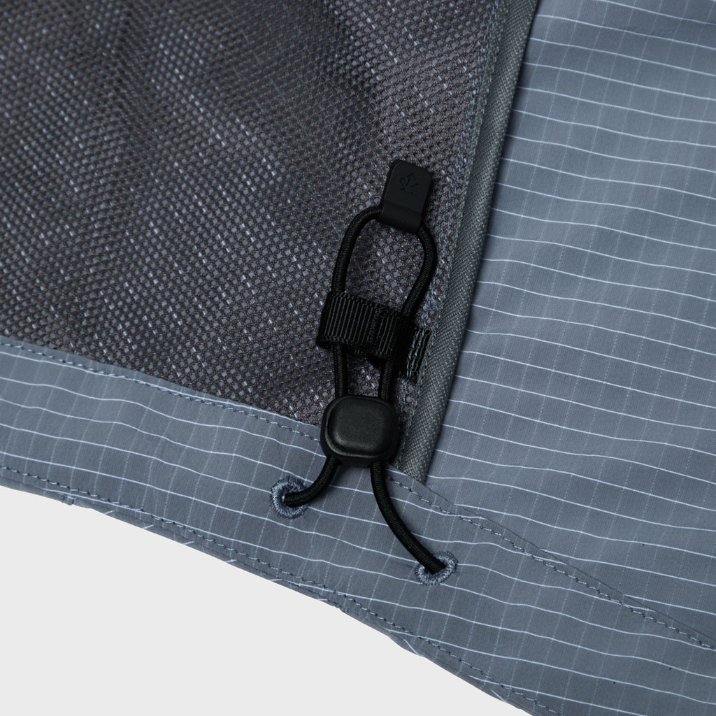 A fullzip jacket in a distinctive ripstop fabric that changes appearance with light and angles. Alternating thick and thin warp yarns (40D filament and 160D Taslan) are used to create surface texture, while weft yarns resist dyeing and reflect light for a rich, multidimensional look. The front has a seamless, origamiinspired three piece VZ (ventilation) structure, blending aesthetics and airflow. The left chest pocket opens from the bottom to reveal a mesh patch pocket and a welt pocket with a key hook ? fusing utility with modern design to bring a new rhythm to everyday movements. This parka brings out the uniqueness of the fabric, showcasing its appeal through both appearance and functionality.