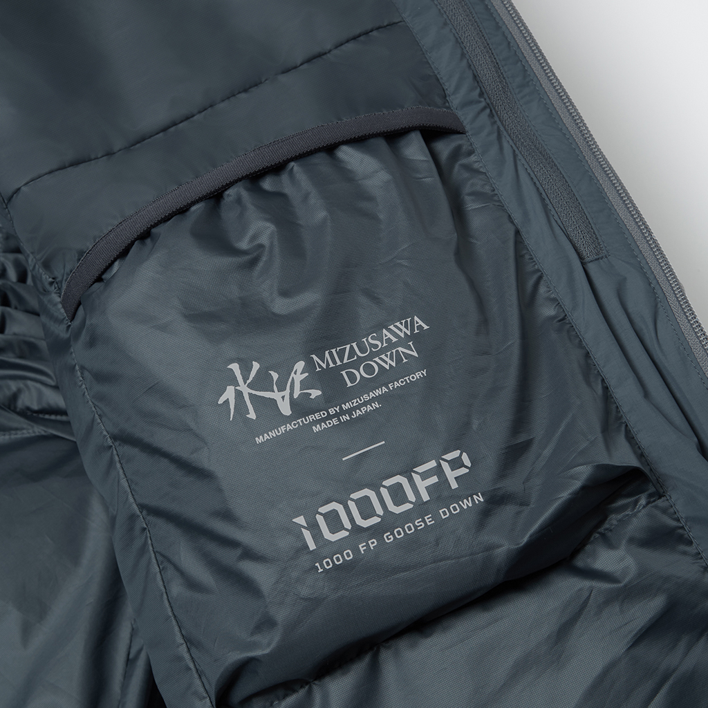 The design of Vertex 1000FP, the top-of-the-range model of the Mizusawa Down Jacket series for 2024, have been updated. The outer fabric is extremely lightweight DERMIZAX? 30d NYLON TAFFETA with an excellent balance between strength and durable water repellency. The insulation is 1000FP down, the lightest and bulkiest available, providing unprecedented warmth and airy comfort. It is 10% lighter than the previous model, while warmth retention has also been improved, with its HEAT NAVI?, lining now pleated to increase the surface area where light is converted to heat. These new functions in this high performance model are in addition to its highly waterproof non-stitch, heat-bonded quilting and seam taping. The 1000FP insulation also uses DOWNPASS ※1 certified traceable down which is strictly controlled by serial number.※1 DOWNPASS e.V (Germany) is a certification process guaranteeing down feathers are ethically sourced and come from tightly controlled and traceable supply chains, ensuring both animal protection and the maintenance of highest quality feather standards.