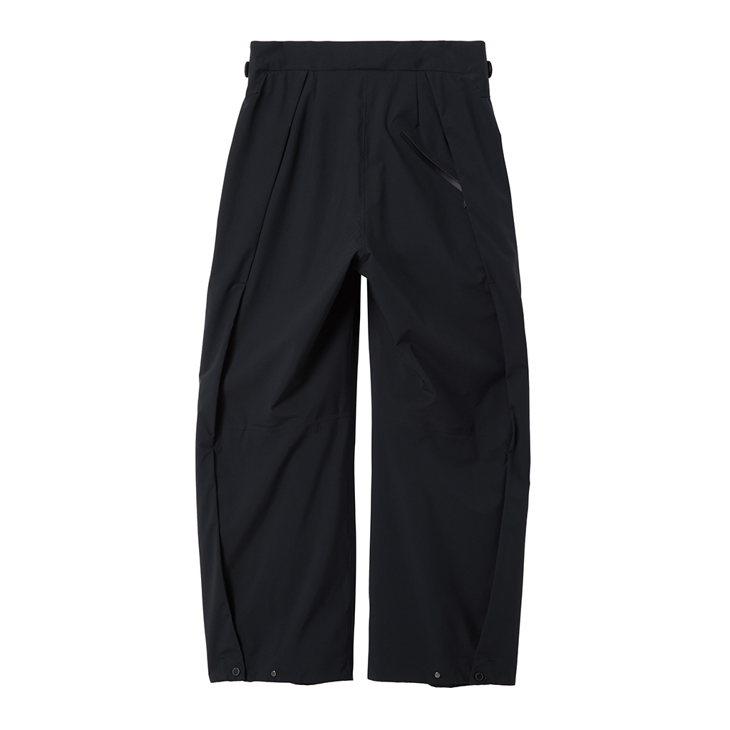 Hard shell pants in DERMIZAX WINDTIGHT NYLON 3L offering an excellent balance between waterproofing and breathability. Large structural flaps on the front allow air to be drawn in to release internal heat and moisture. In addition, the loose-fitting, tuck-width silhouette is designed with a 3D structure allowing air to move easily. The waist features an easy-to-use dial adjuster for one-handed fit adjustment. Snap buttons at the hems allow styling customization. Not just for rainy days outdoors, these waterproof pants also provide functionality as everyday wear.
