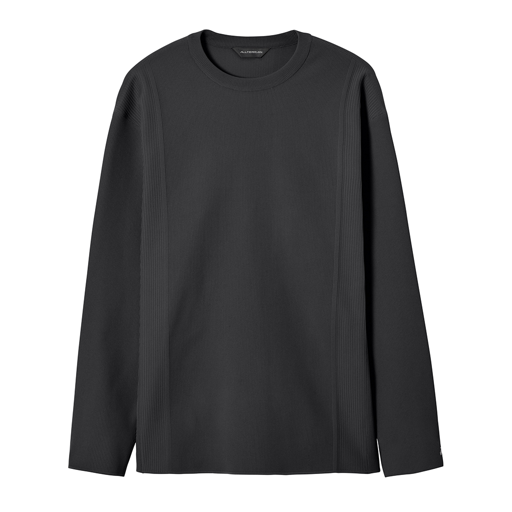 A crew neck in the FUSIONKNIT series. Different jacquard patterns are knitted into a single fabric piece for the body and sleeves for effective breathability and stretch with minimal seaming. Descente's unique pattern-making ensures a 3D silhouette and airy comfort. The textured inner knit minimizes skin contact, for added comfort. This crew neck combines freedom of movement and comfort in a seamless design using knit and sew manufacturing with ultrasonic welding and heat bonding.