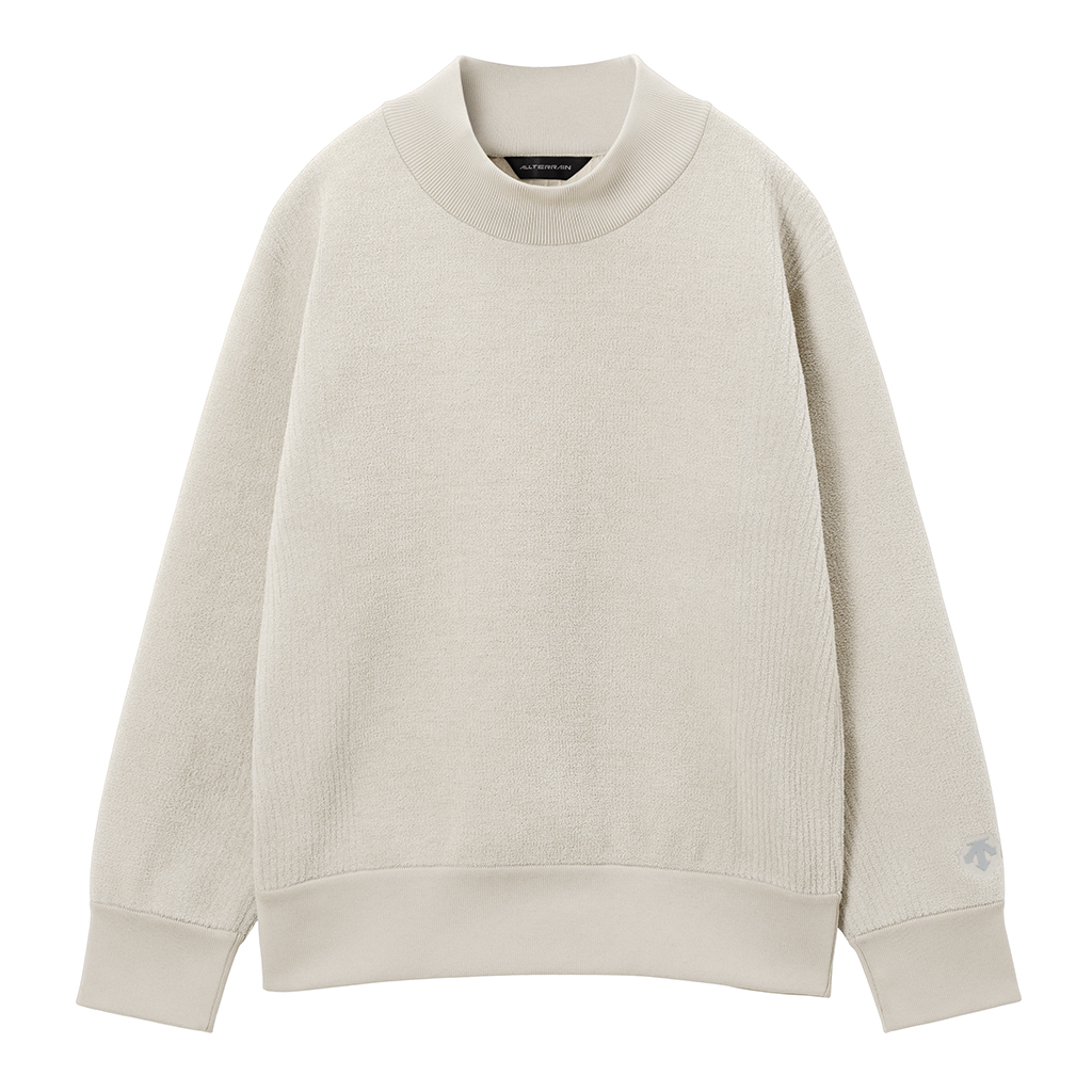 A stripe pattern knitted crew neck sweatshirt in the FUSIONKNIT series. Different jacquard patterns are knitted into a single fabric piece for the body and sleeves for effective breathability and stretch with minimal seaming. Descente's unique pattern-making ensures a 3D silhouette and airy comfort. The textured inner knit minimizes skin contact. This crew neck sweatshirt combines freedom of movement and comfort in a seamless design using knit and sew manufacturing with ultrasonic welding and heat bonding.