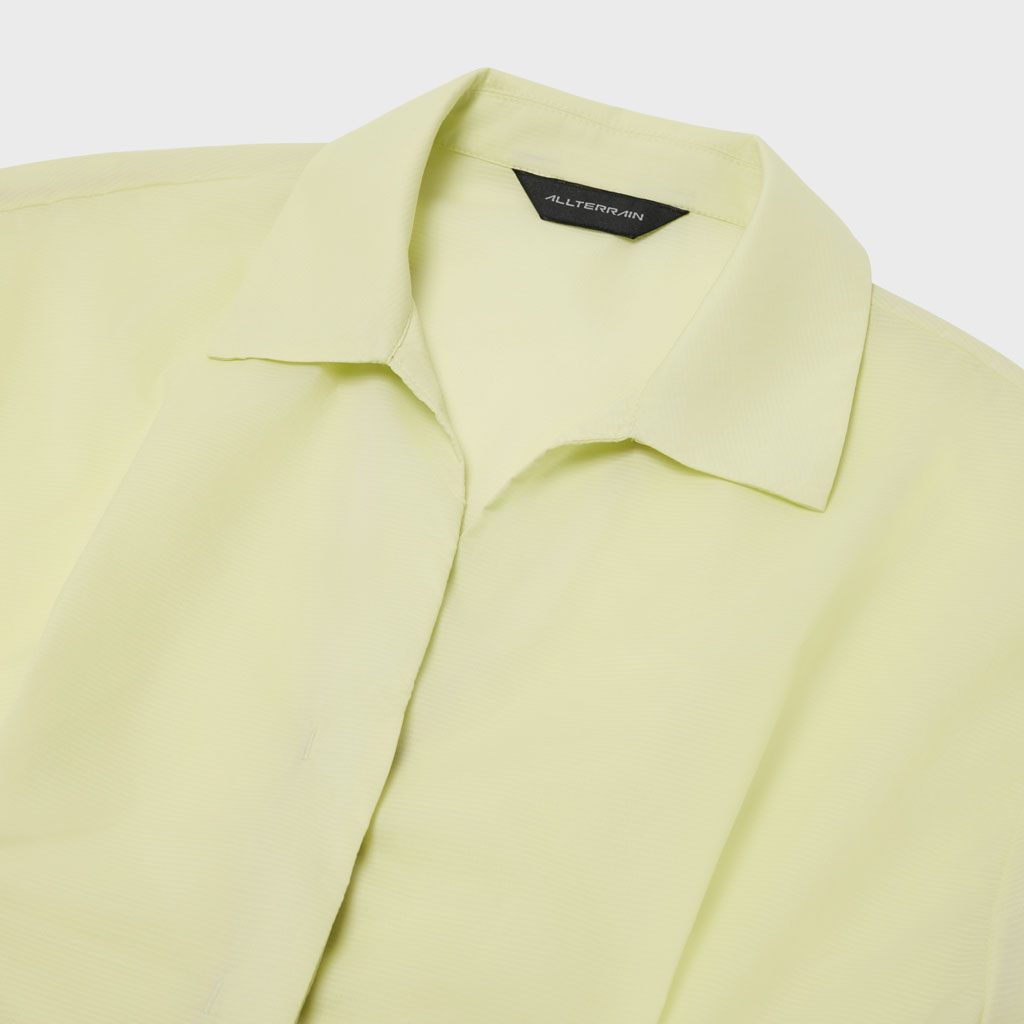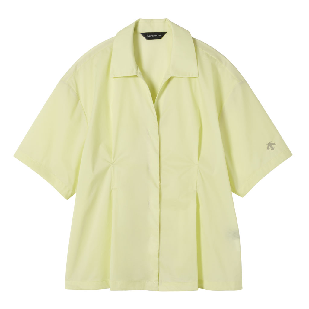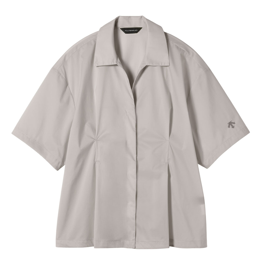 A half-sleeve skipper collar shirt in a sheer fabric with water repellency and breathability. Tucks at the front and back of the waist give a structured look and promote internal airflow. Laser-cut underarm perforations support ventilation and the skipper collar enhances comfort awith a polished, feminine look.