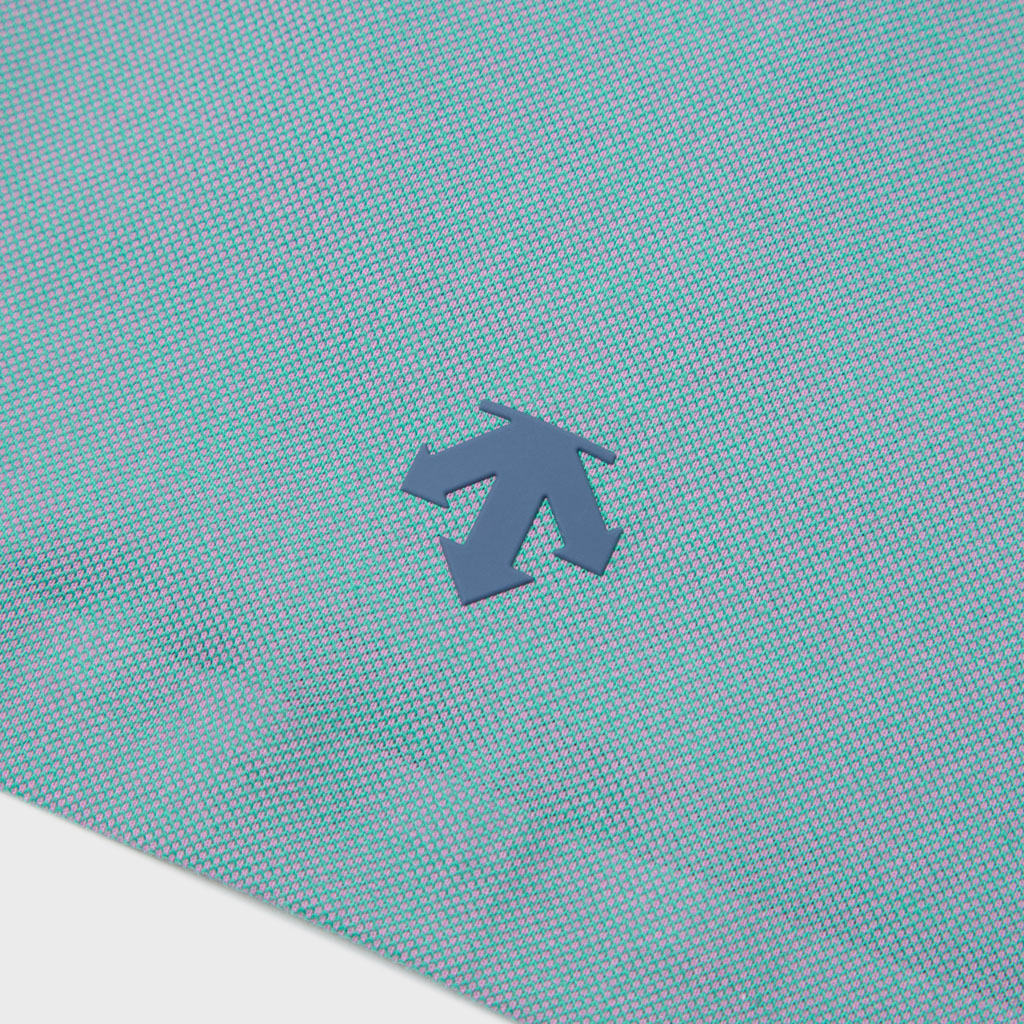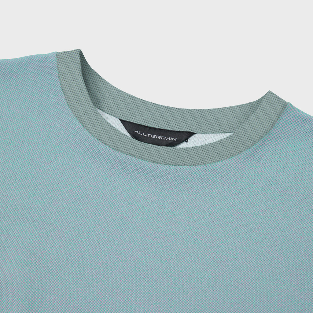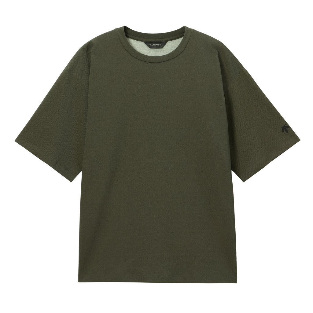 A short sleeve T-shirt combining heat shielding and UV blocking functional yarn with cotton. The proprietary fabric offers a natural cotton texture with stretch, and is quick-wicking and quick-drying. The piqué knit structure is comfortable in spring and summer. It has a dynamic chambray coloration that changes with movement, giving it visual depth. Ultrasonic processing and thermal bonding create a seamless design and improved skin comfort.