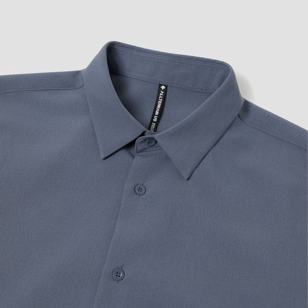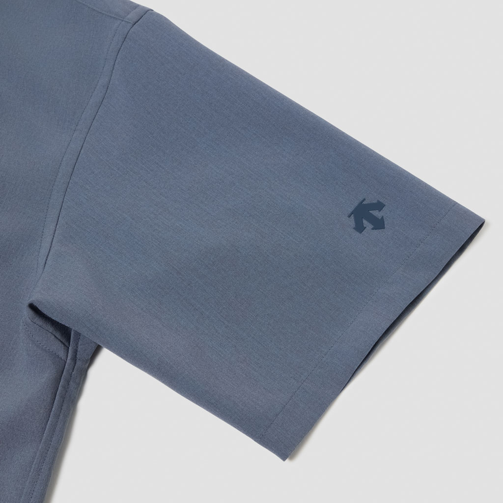 A half-sleeve shirt in a wool-like fabric characterized by its drape and fluidity. Suitable for business wear, either with matching pull-on pants or with standard business pants. The added water-repellent finish protects against sudden rain and ensures all day comfort.