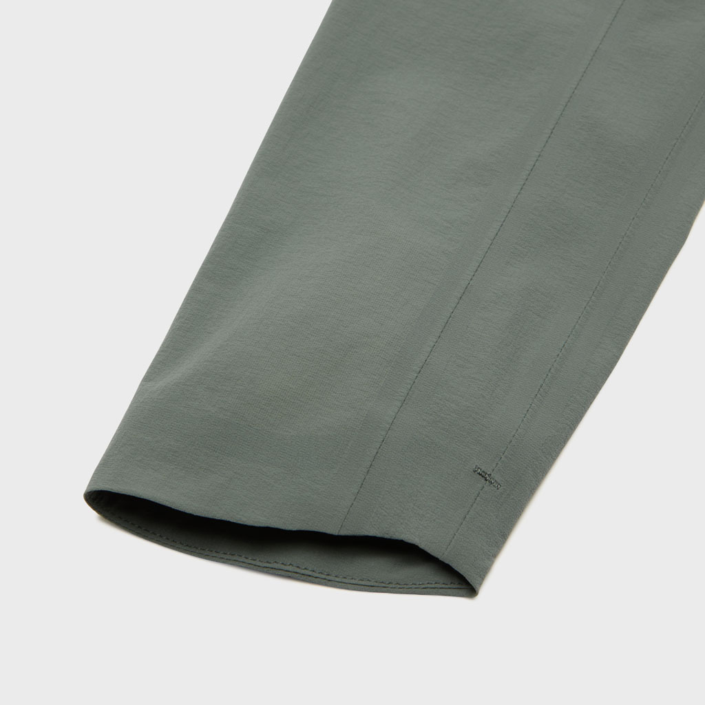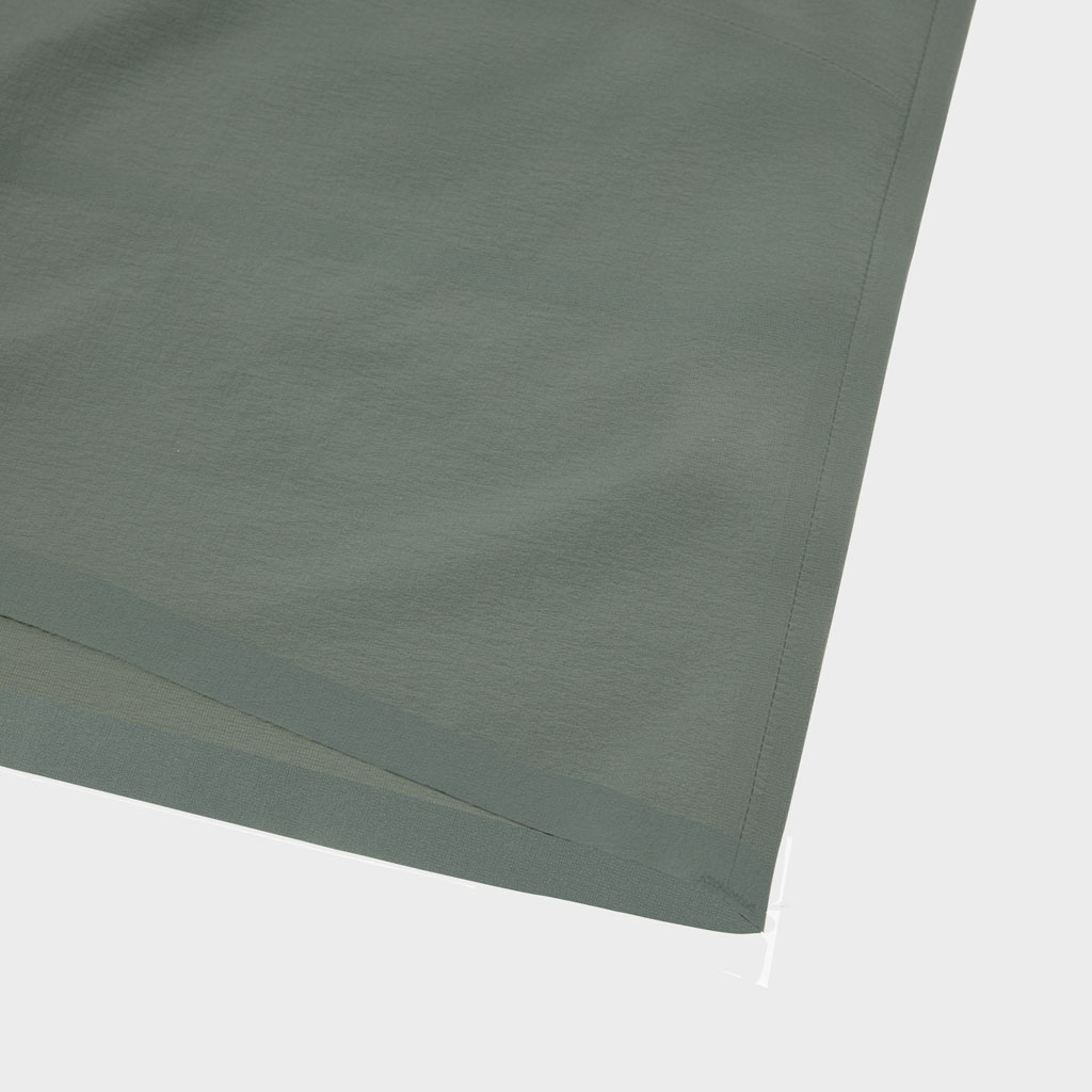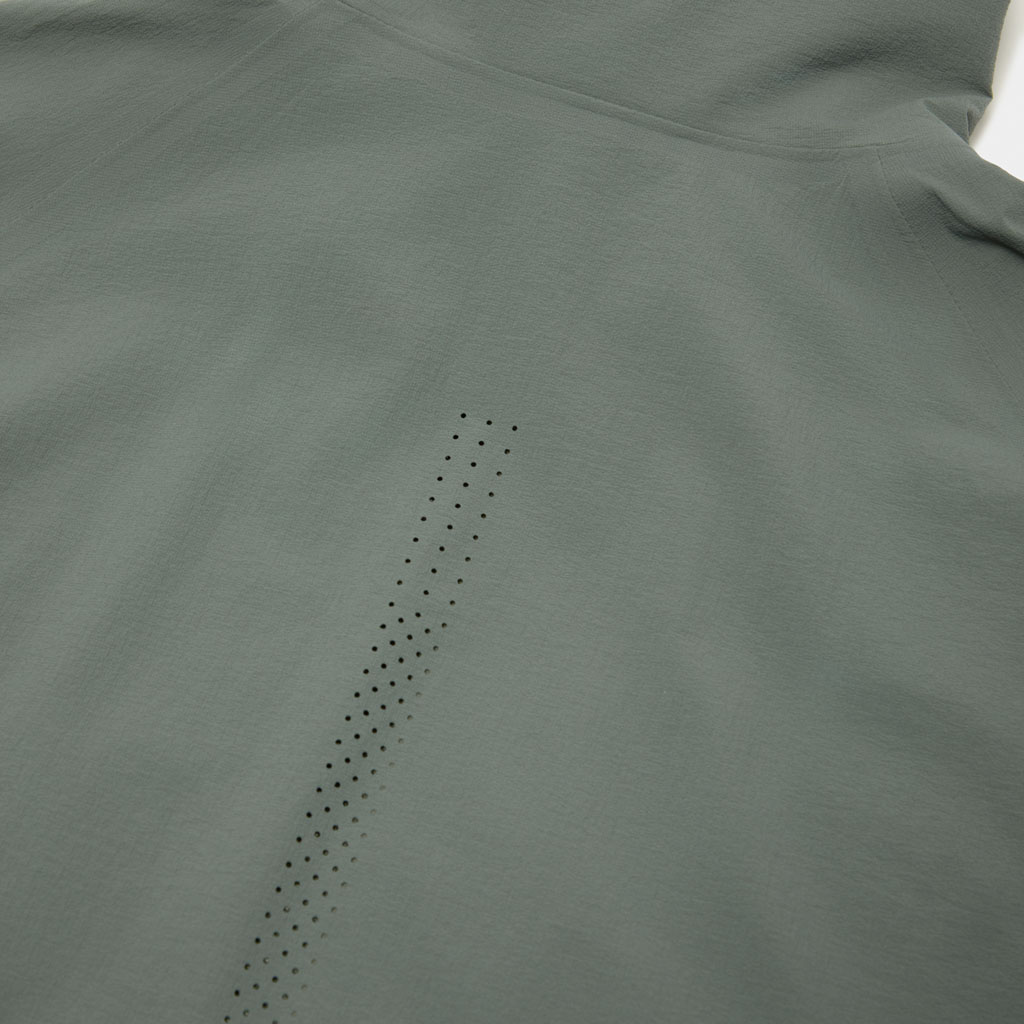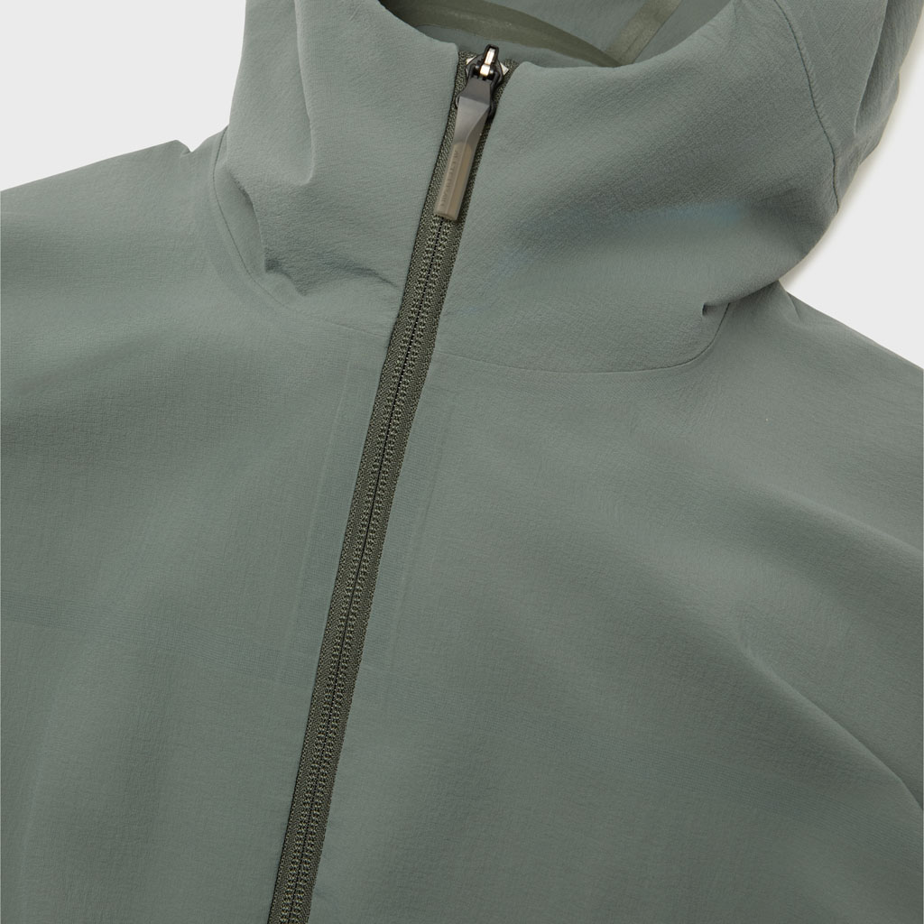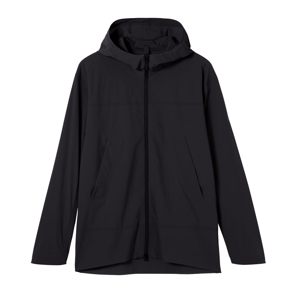 A hoodie jacket in a specially developed free-cut woven fabric with superior stretch and water-repellency. Ultrasonic seam welding reduces skin contact with stitching, and cut edges do not fray, enabling a minimalist, clean aesthetic. Ideal for unpredictable weather and temperature fluctuations.