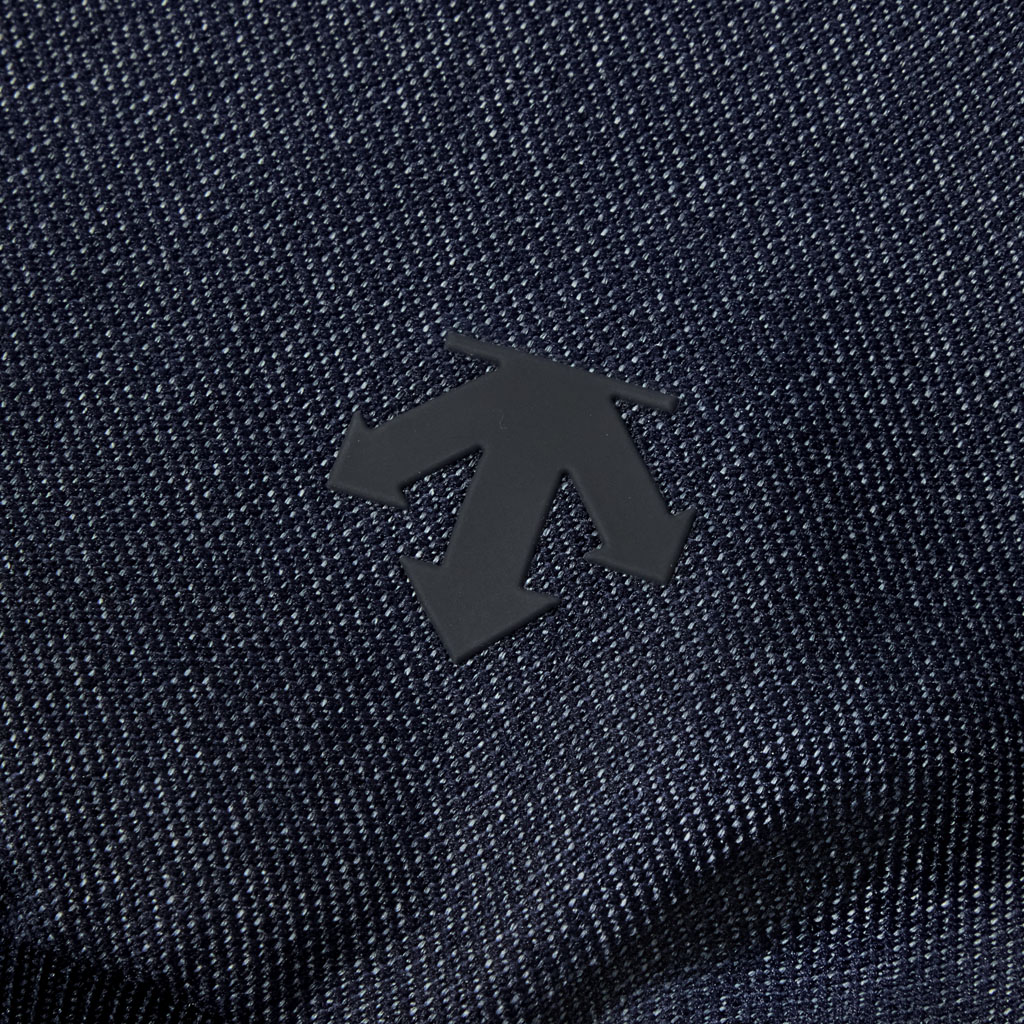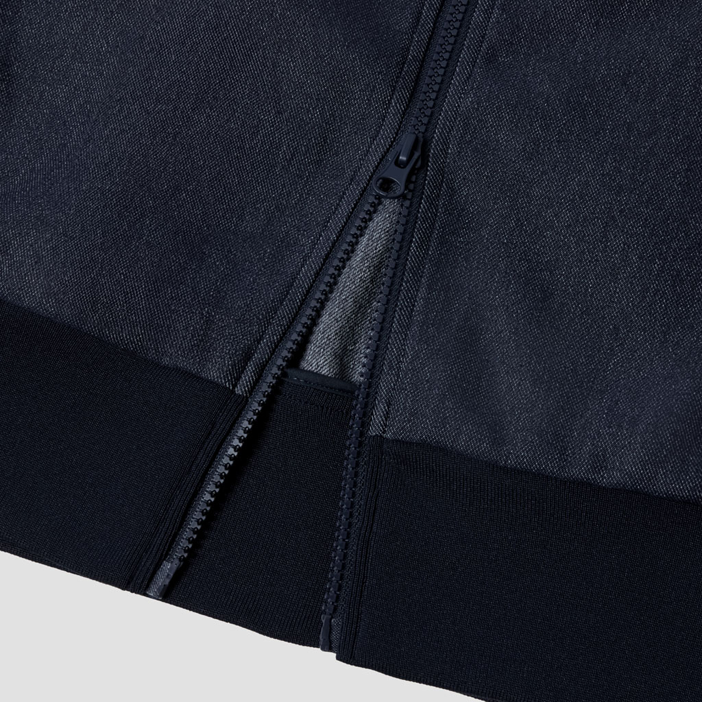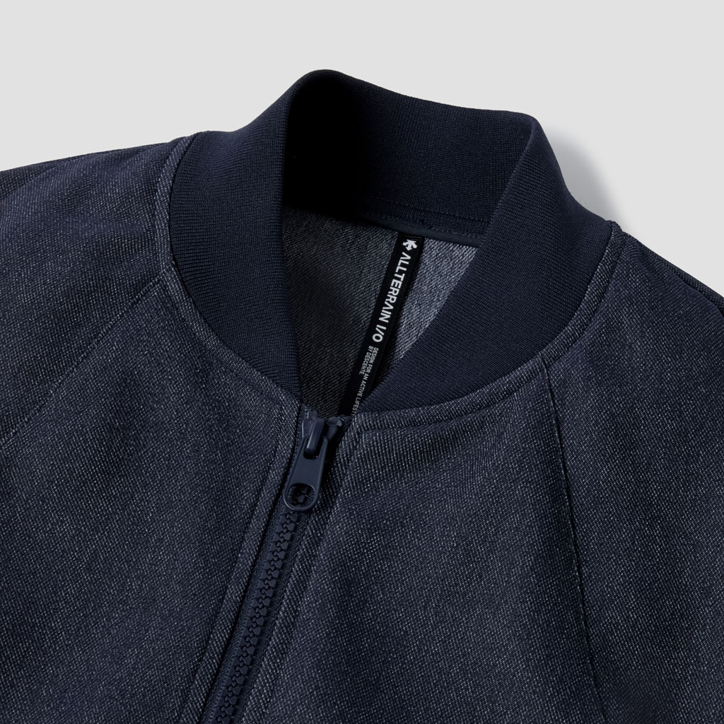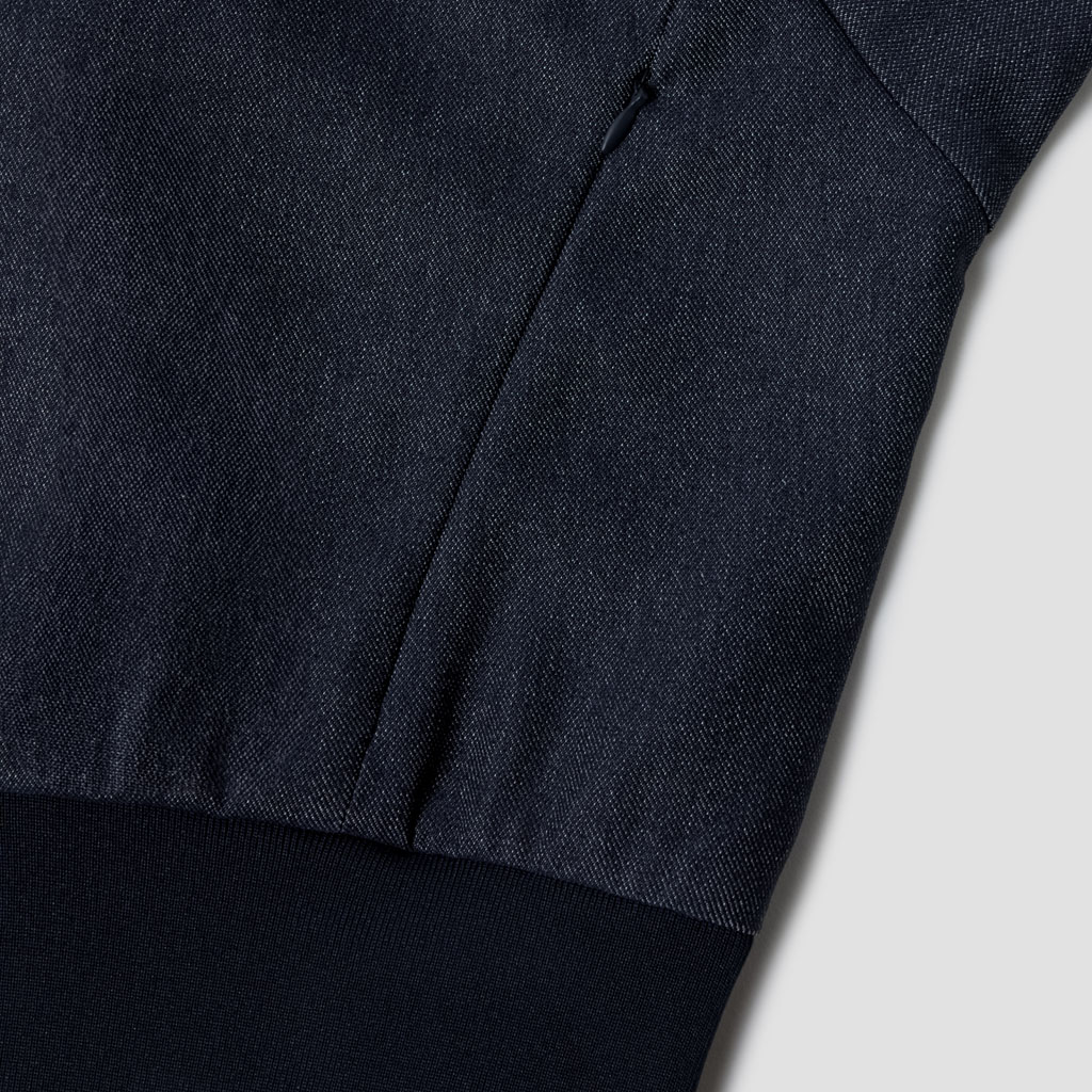 A blouson in a 100% polyester denim-like material. Unlike traditional denim which is a weave of navy and white yarns, this is woven with navy and heathered yarns for a more refined appearance. The added water-repellent finish protects against sudden rain and ensures all day comfort. It can be paired with matching denim-like pants.