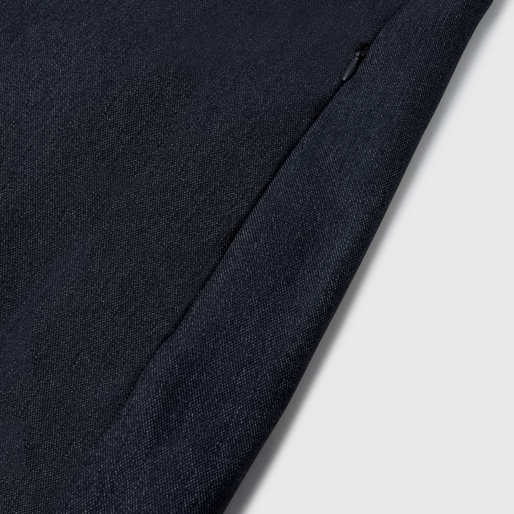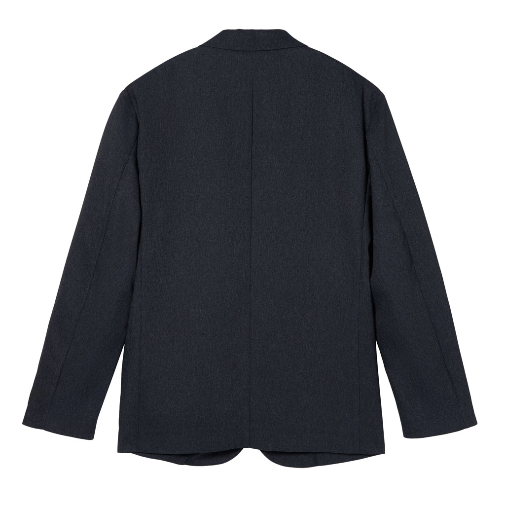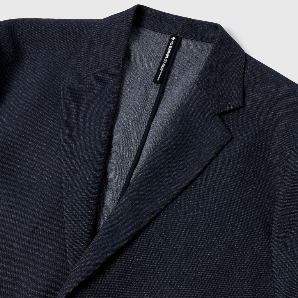 A tailored jacket in a 100% polyester denim-like material. Unlike traditional denim which is a weave of navy and white yarns, this is woven with navy and heathered yarns for a more refined appearance. The added water-repellent finish protects against sudden rain and ensures all day comfort and great versatility.