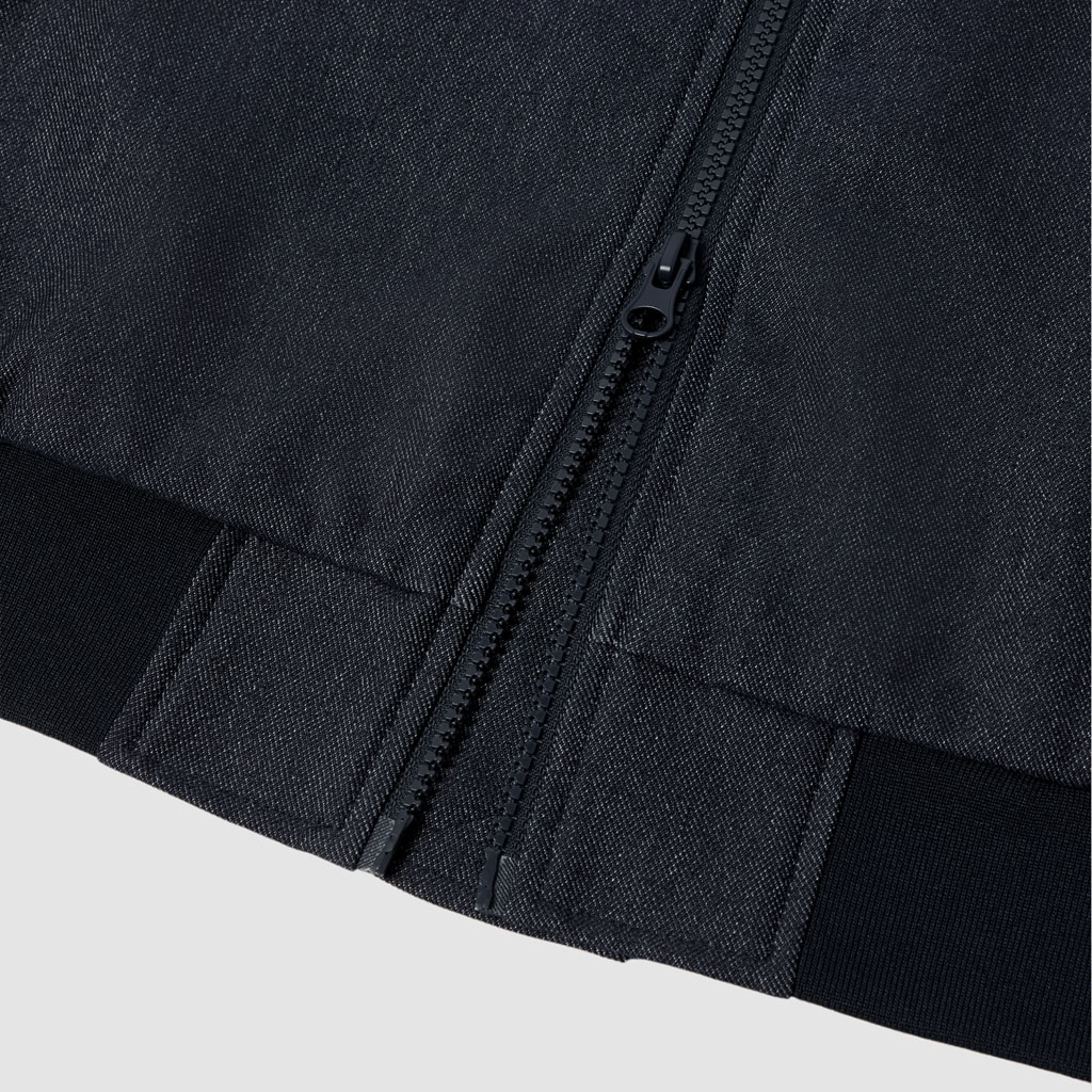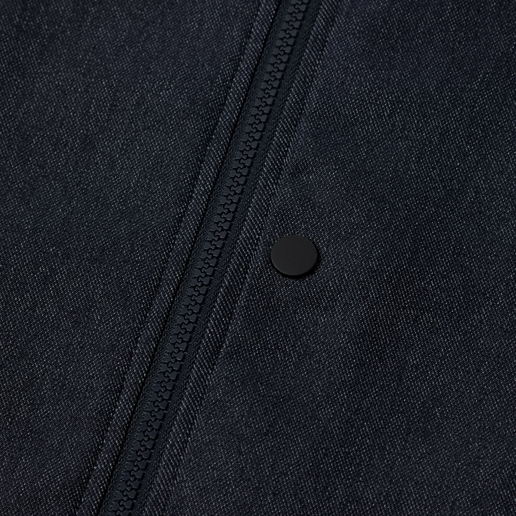 An MA-1 style jacket in a 100% polyester denim-like material. Unlike traditional denim which is a weave of navy and white yarns, this is woven with navy and heathered yarns for a more refined appearance. The added water-repellent finish protects against sudden rain and ensures all day comfort. It can be paired with matching denim-like pants.