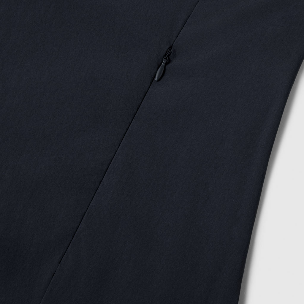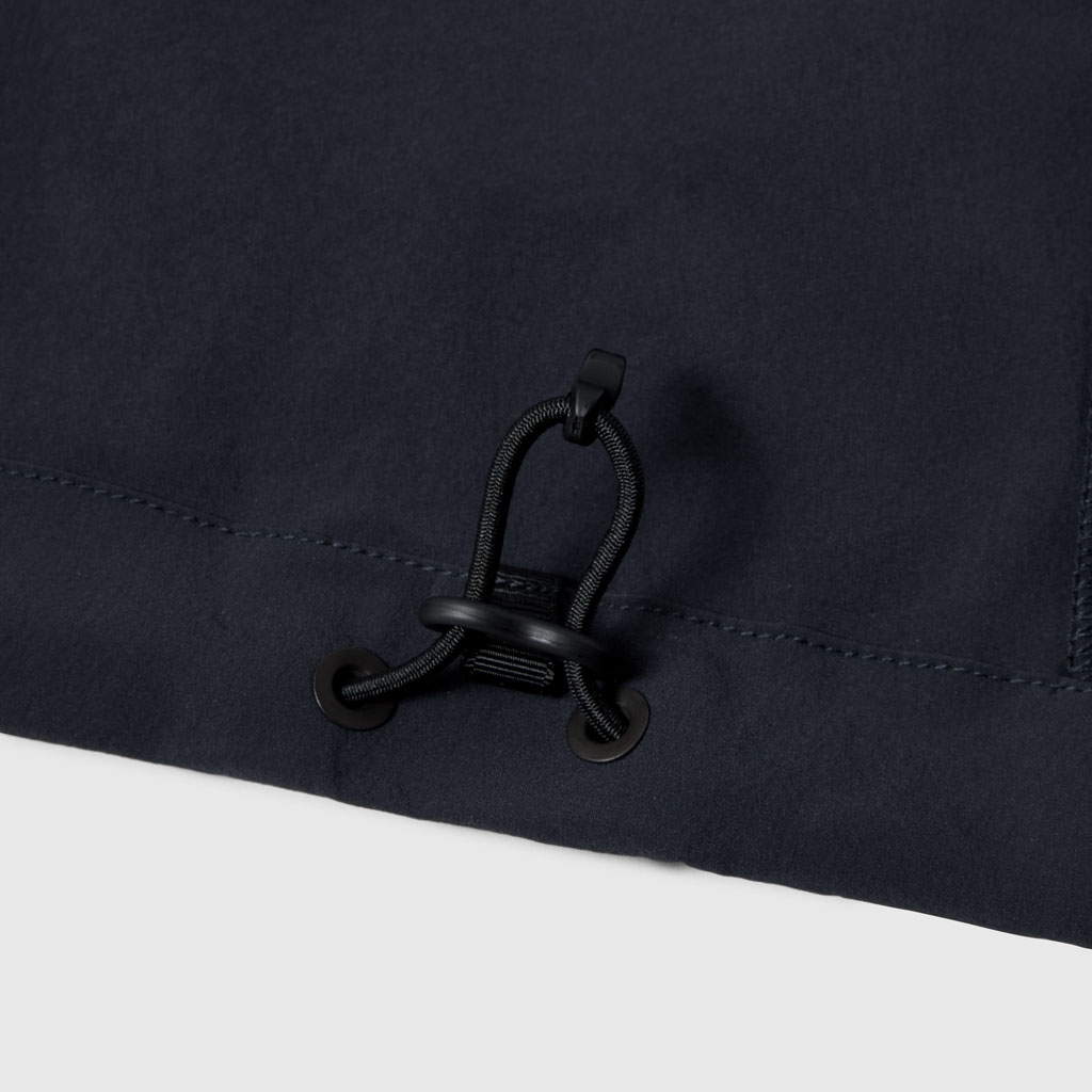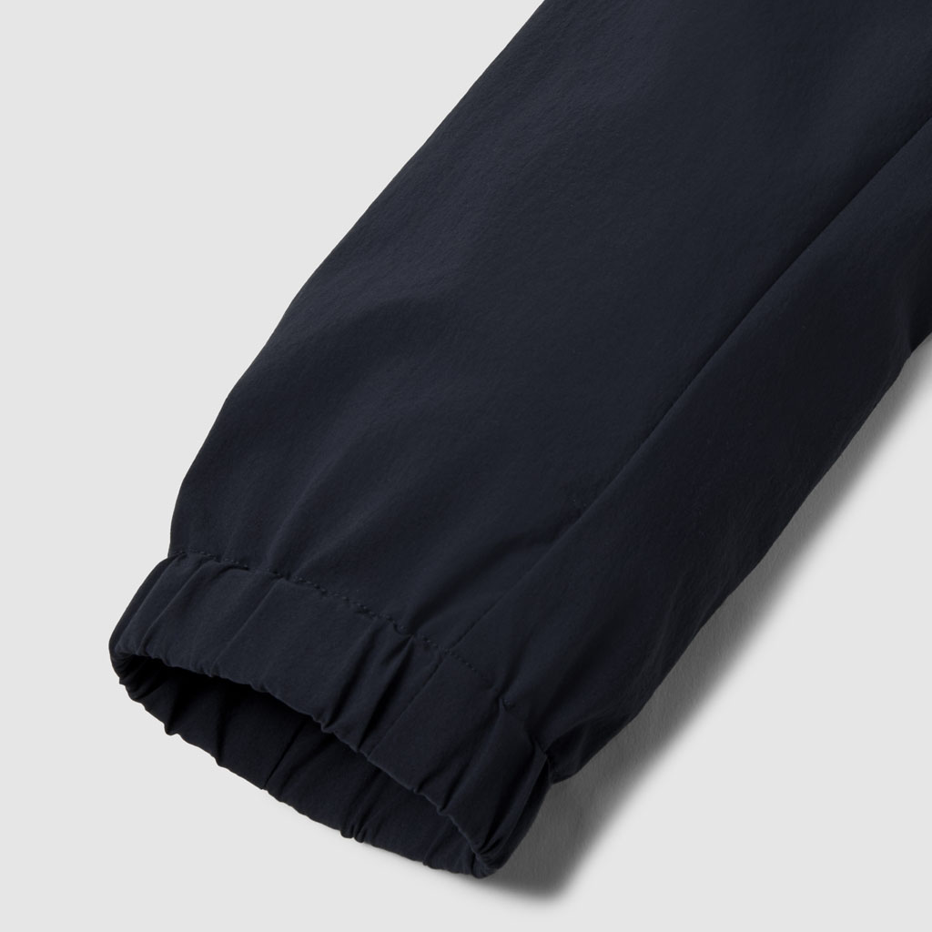 A lightweight track jacket in 4 way stretch, water repellent, recycled nylon. Ideal for everyday use with pattern engineering that maximizes freedom of movement. A slightly loose silhouette with elasticized hem and cuffs offers a comfortable fit. The design is minimalist but the addition of a large chest logo gives it modern sportswear appeal. It can be paired with the TRACK series pants in the same fabric.