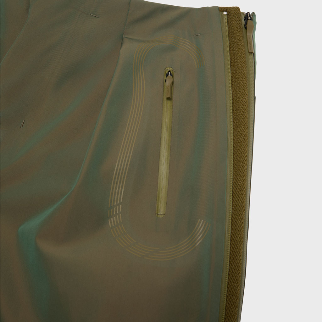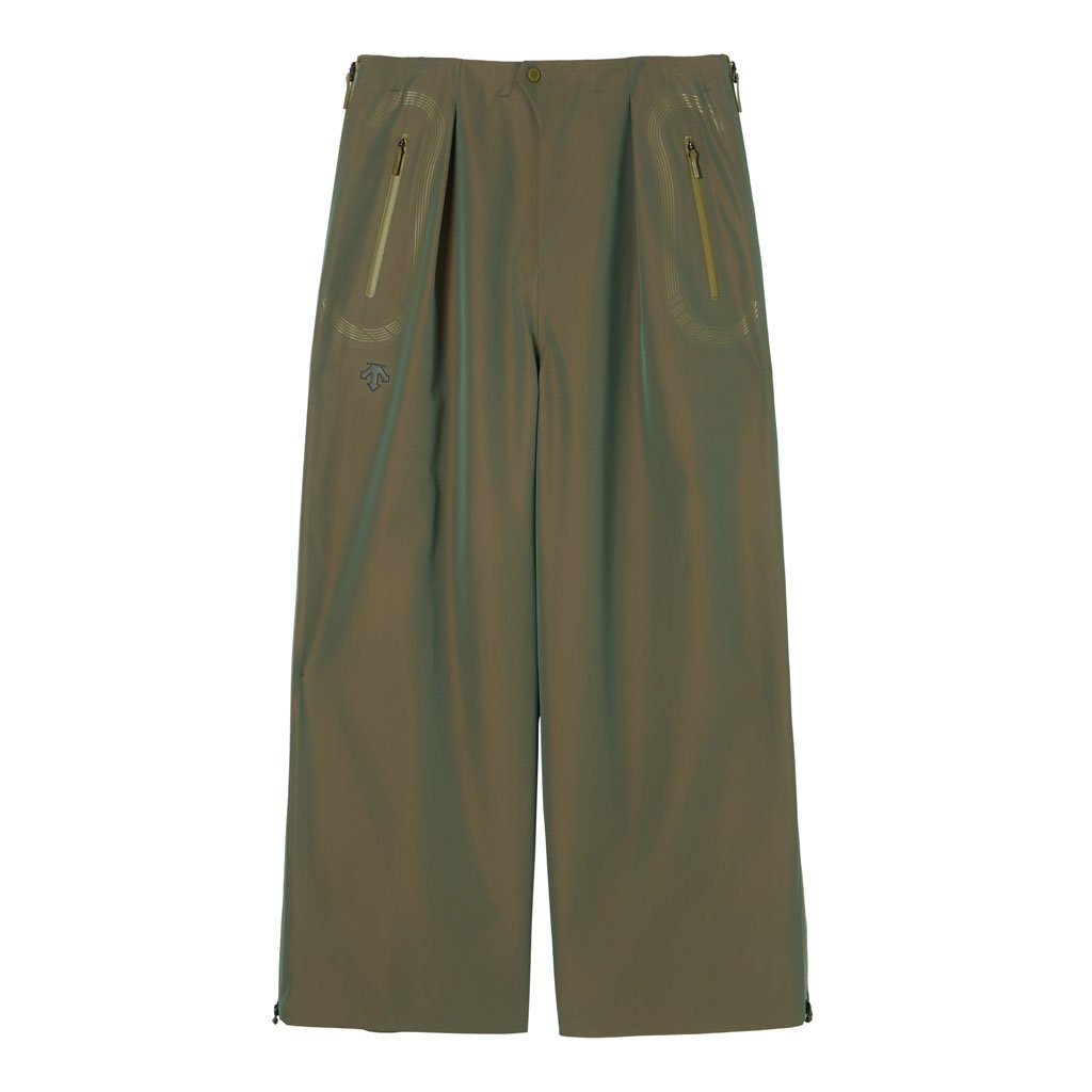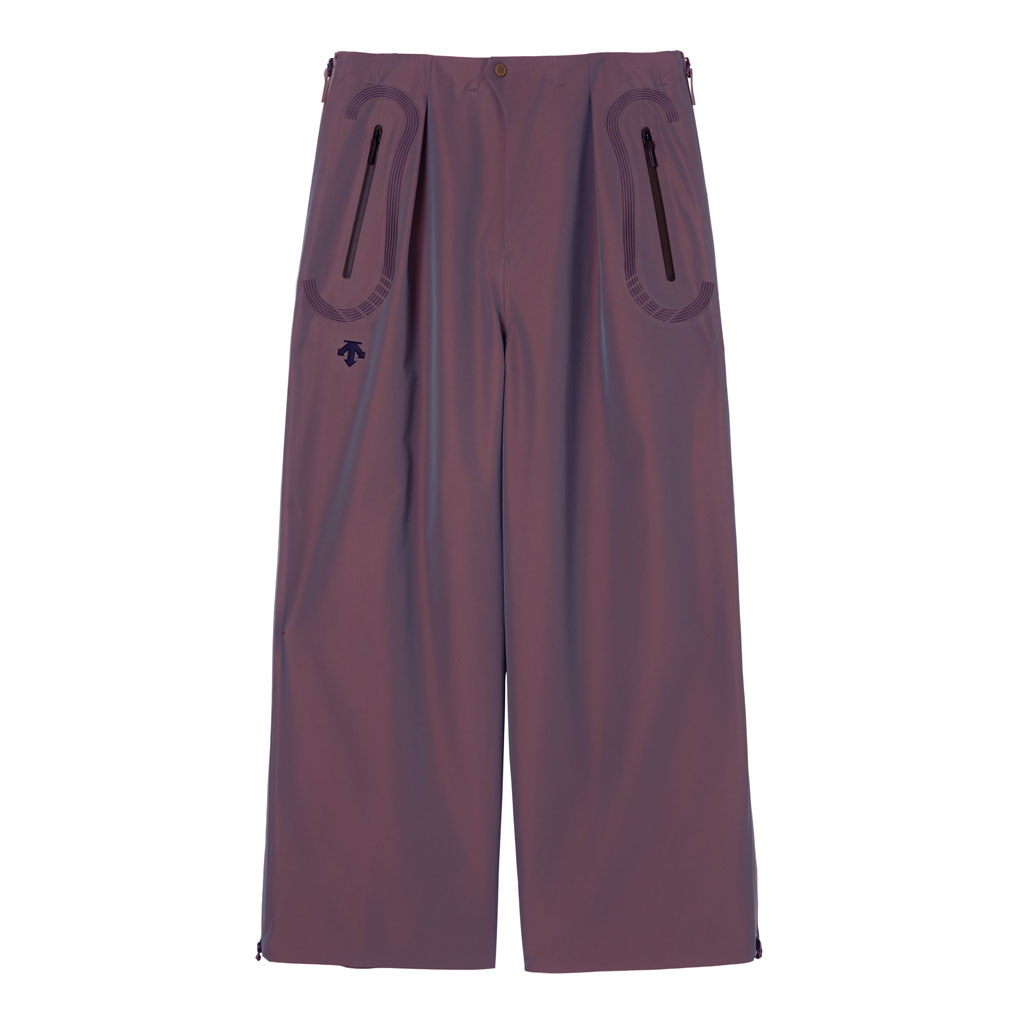 Hard shell pants in a lustrous chambray fabric, engineered with superior waterproofing and breathability. The dynamic color tone changes with movement, giving visual depth. Essentially wide silhouette overpants with relaxed tucks, creating a 3D effect. Both legs have DESCENTE’s Dual Ventilation System, with zipper adjustment enhancing ventilation when necessary. Streamline Technology around the hip pockets channels water away, keeping the area dry even in the rain. Snap buttons at the hem enable silhouette adjustment for various styling options. Rain pants reimagined.