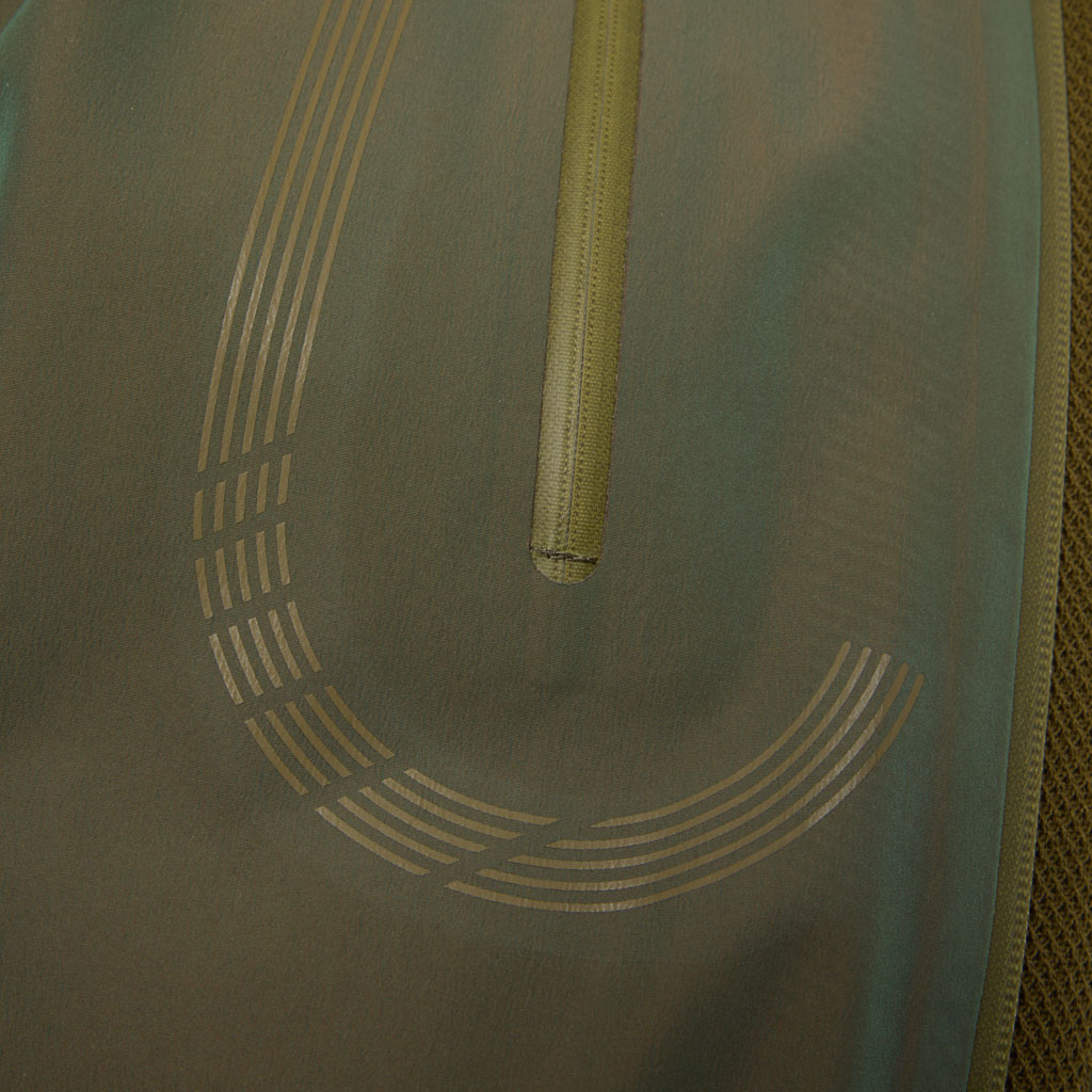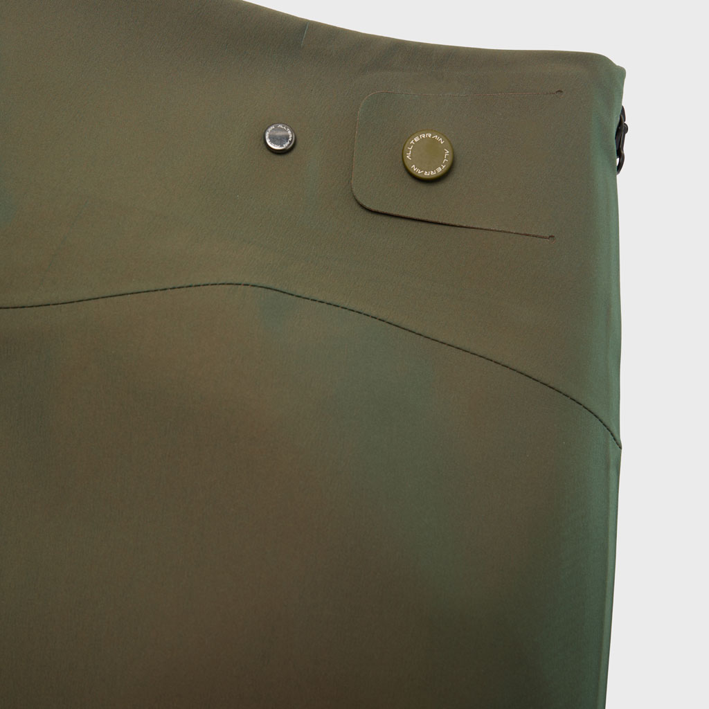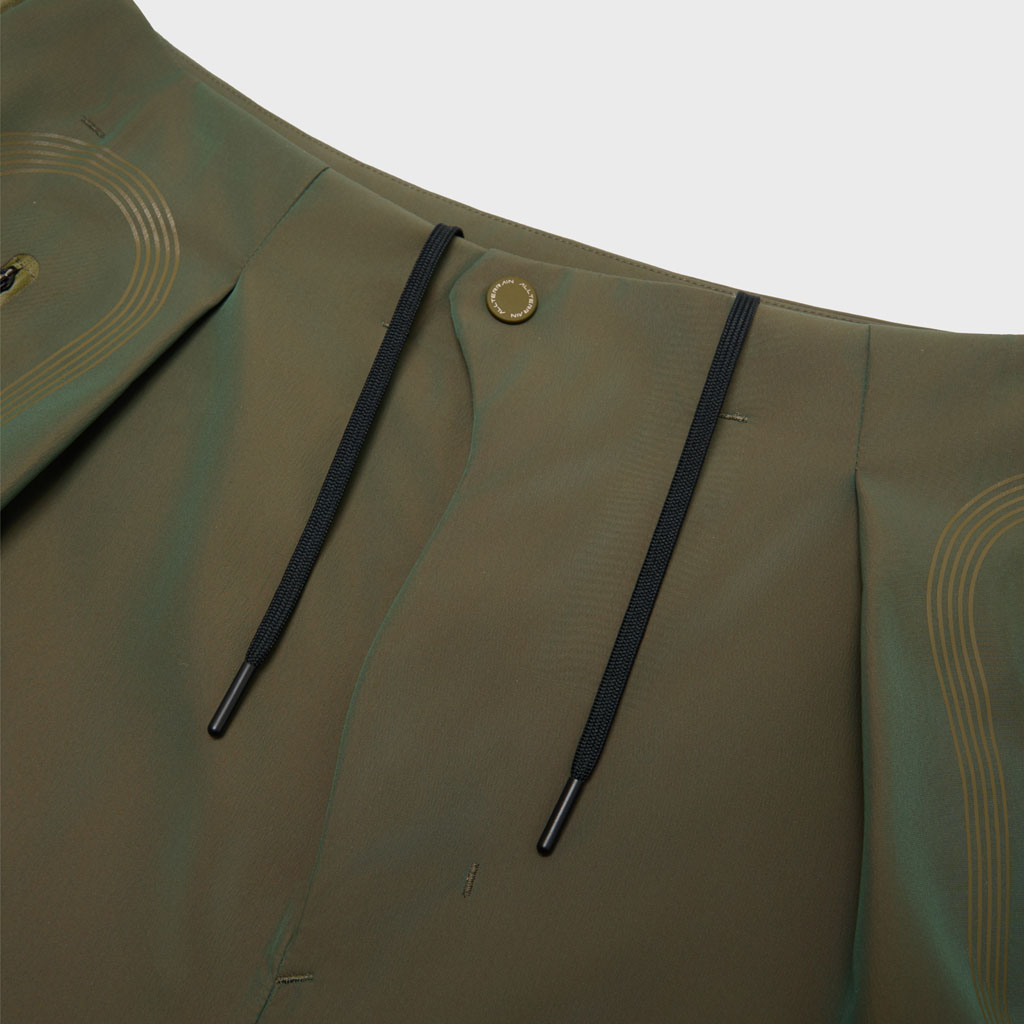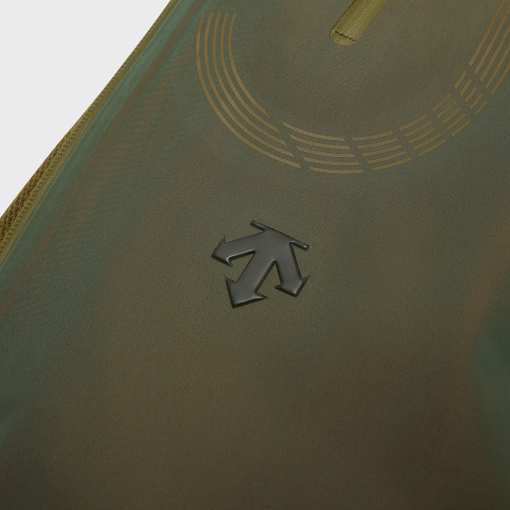 Hard shell pants in a lustrous chambray fabric, engineered with superior waterproofing and breathability. The dynamic color tone changes with movement, giving visual depth. Essentially wide silhouette overpants with relaxed tucks, creating a 3D effect. Both legs have DESCENTE’s Dual Ventilation System, with zipper adjustment enhancing ventilation when necessary. Streamline Technology around the hip pockets channels water away, keeping the area dry even in the rain. Snap buttons at the hem enable silhouette adjustment for various styling options. Rain pants reimagined.