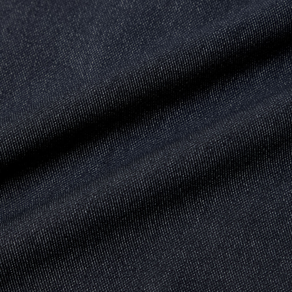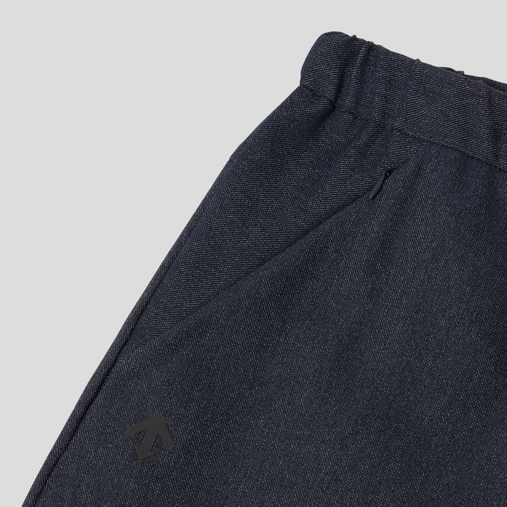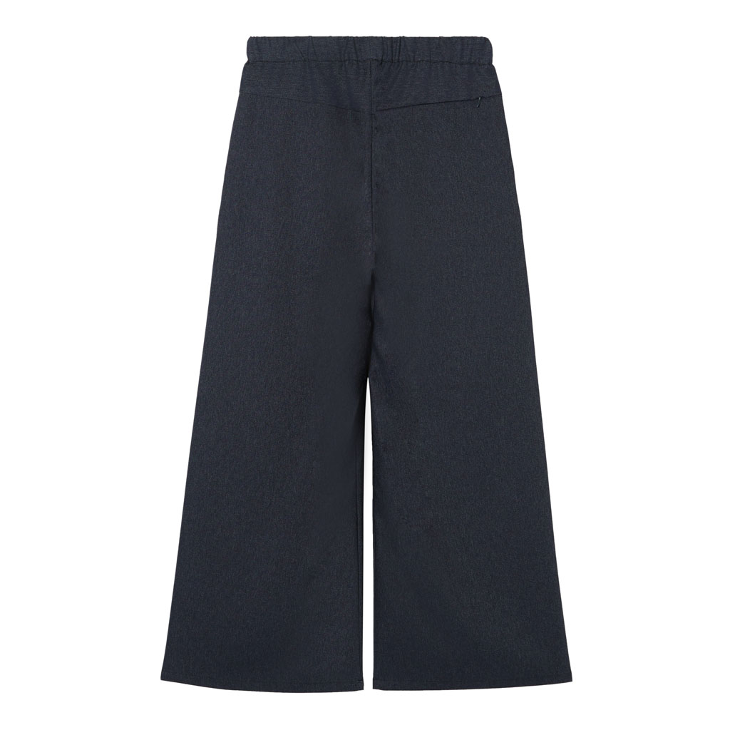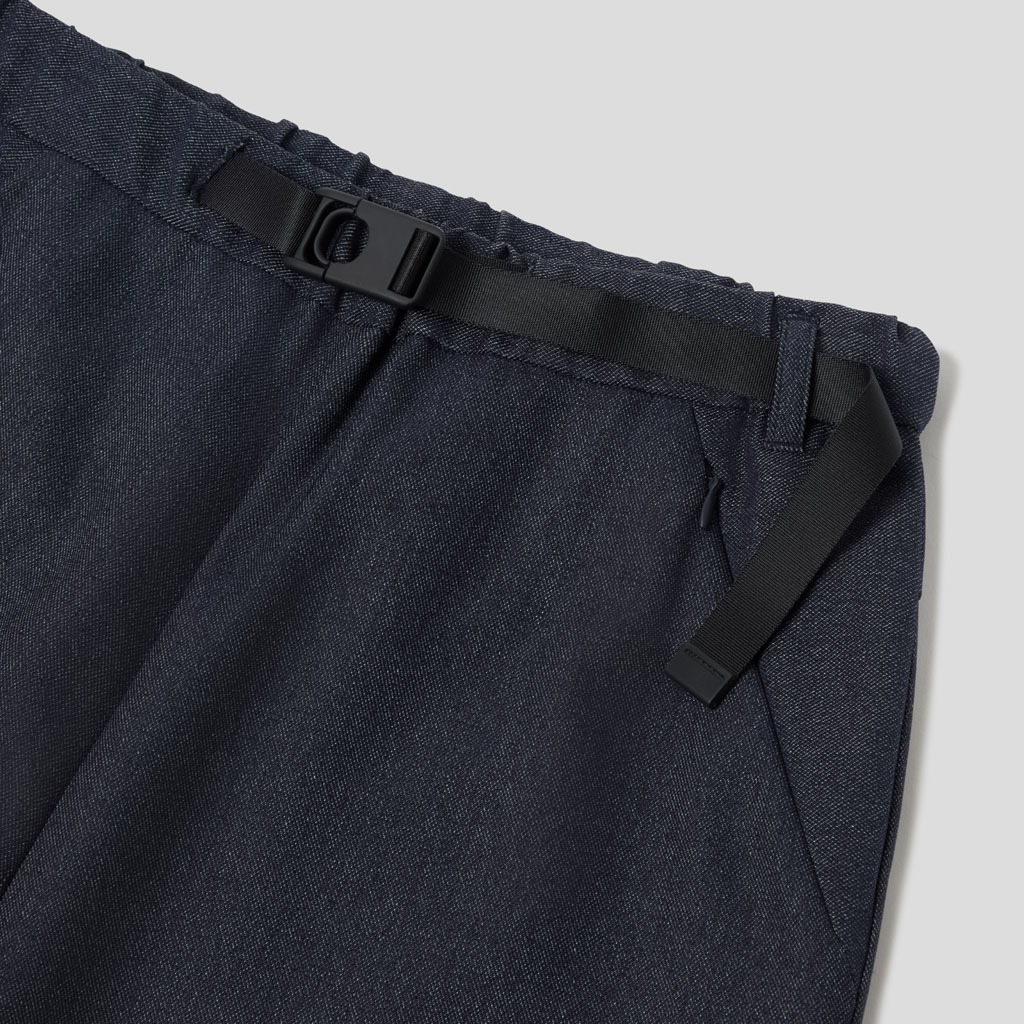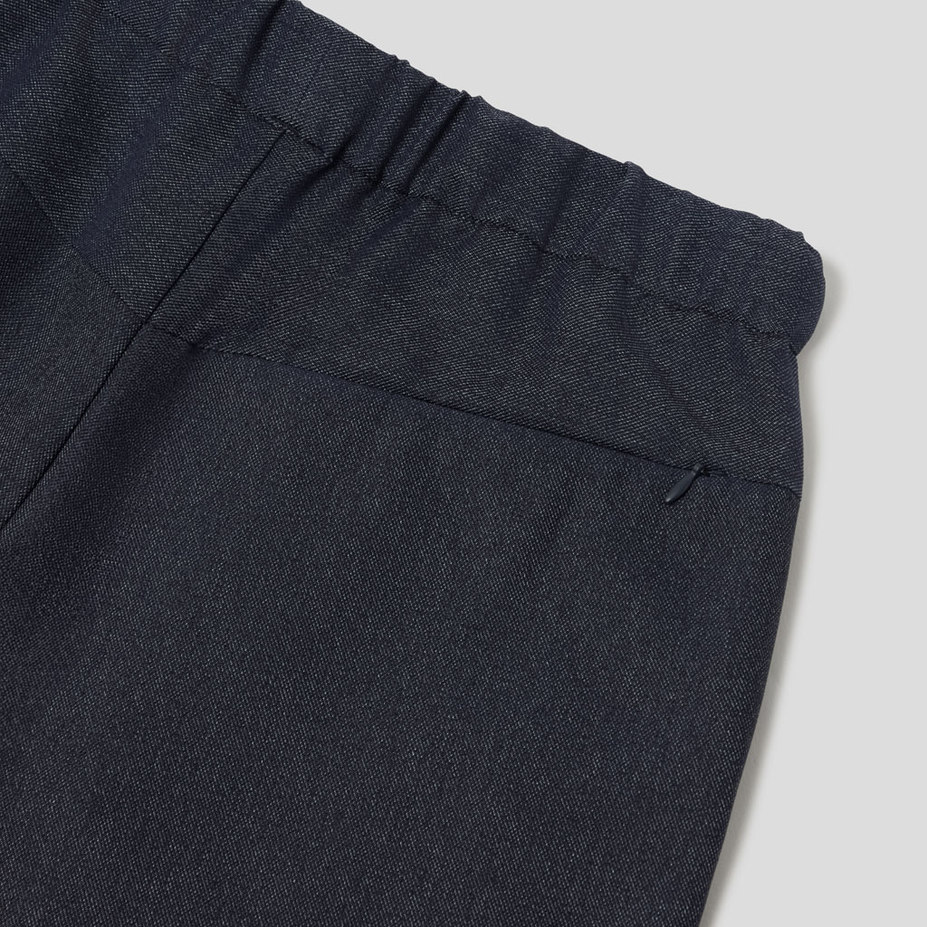 Straight silhouette pants in a 100% polyester denim-like material. Unlike traditional denim which is a weave of navy and white yarns, this is woven with navy and heathered yarns for a more refined appearance. The added water-repellent finish protects against sudden rain and ensures all day comfort and great versatility.They can be paired with a jacket in the same fabric.