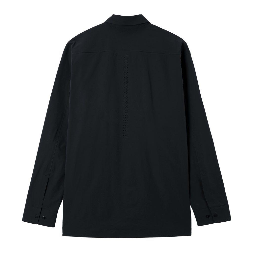 A soft long sleeve shirt with excellent stretch and water repellency. The relaxed silhouette creates an airy, comfortable fit. Ultrasonic welding and heat bonding create a seamless interior and ensure the stretch is unimpeded. Its minimalist aesthetic offers styling options for both business and casual settings.