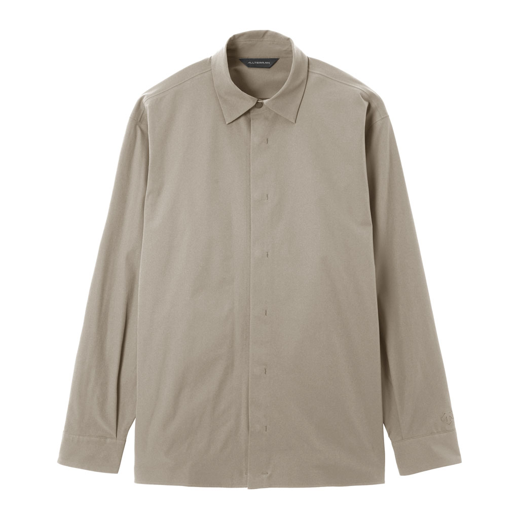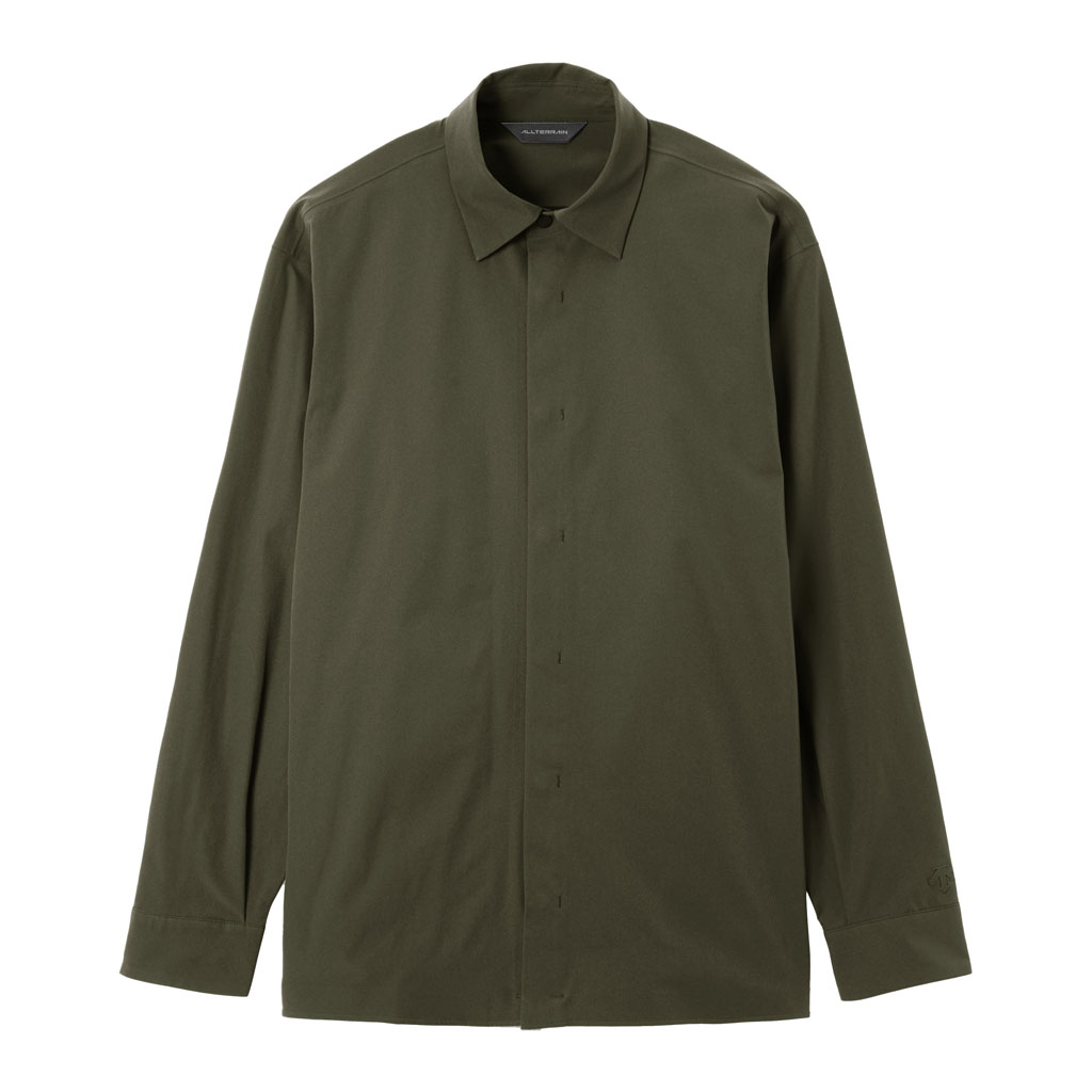 A soft long sleeve shirt with excellent stretch and water repellency. The relaxed silhouette creates an airy, comfortable fit. Ultrasonic welding and heat bonding create a seamless interior and ensure the stretch is unimpeded. Its minimalist aesthetic offers styling options for both business and casual settings.