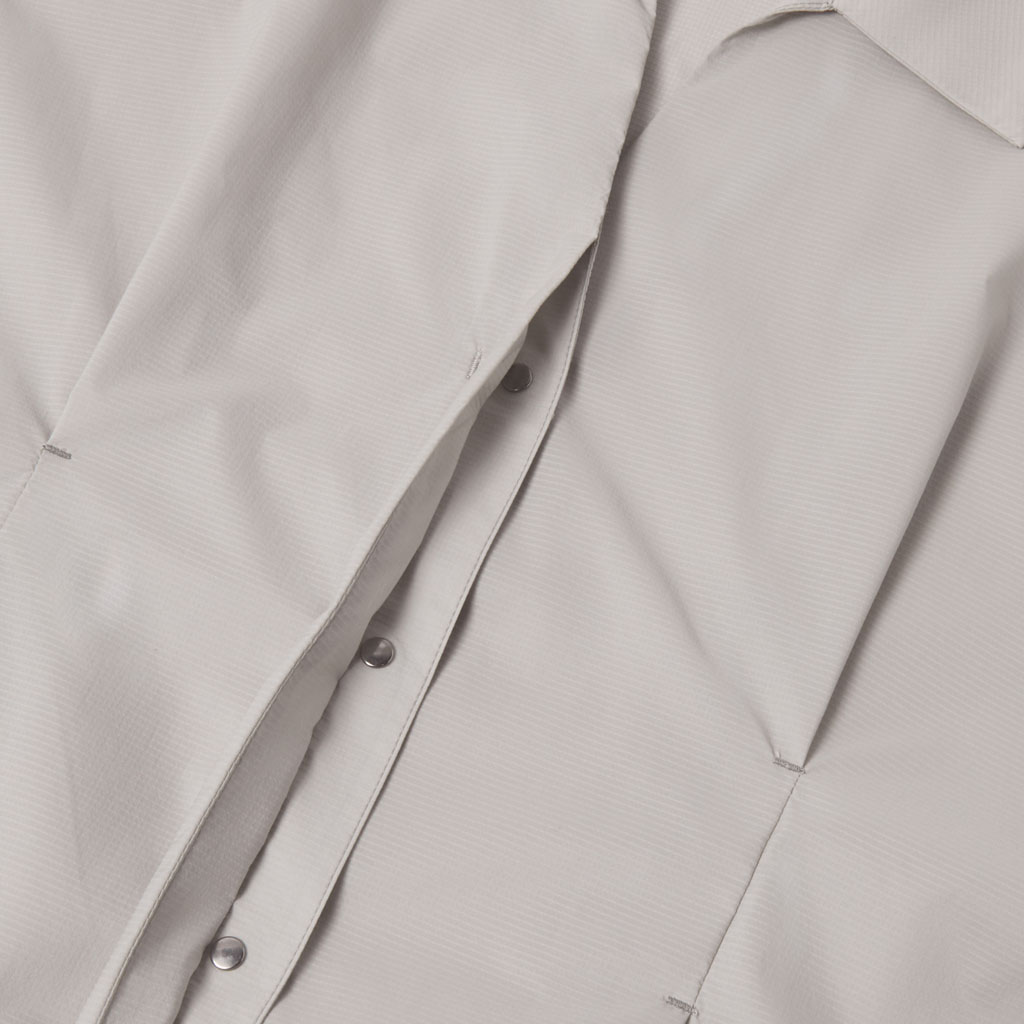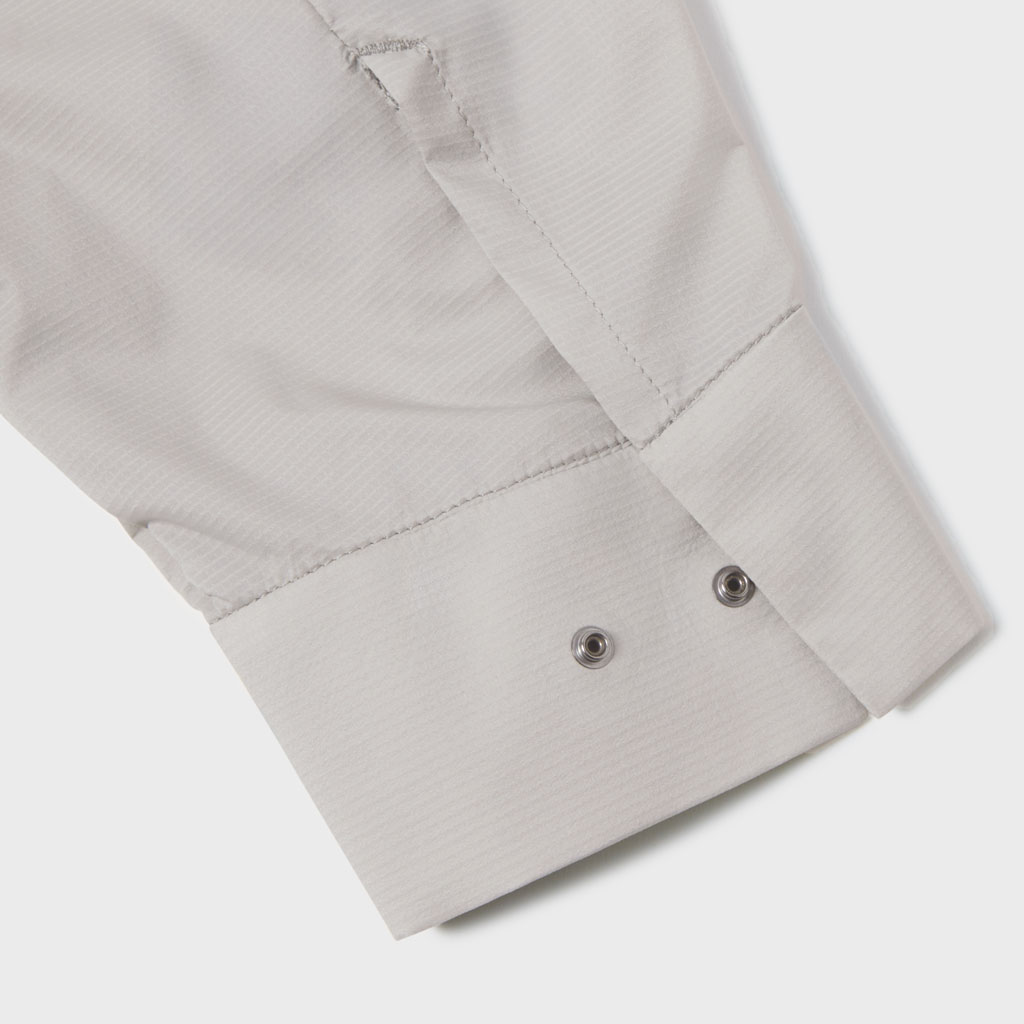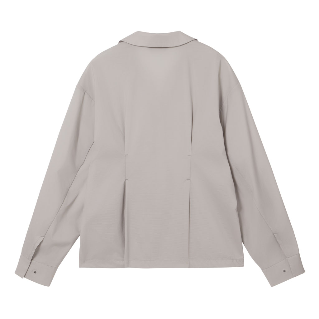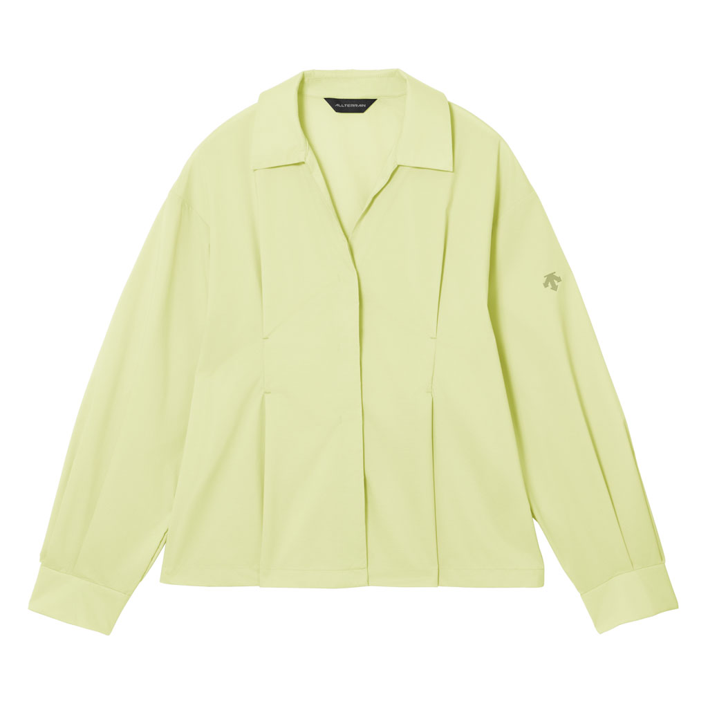 A long-sleeve skipper collar shirt in a sheer fabric with water repellency and breathability. Tucks at the front and back of the waist give a structured look and promote internal airflow. Laser-cut underarm perforations support ventilation and the skipper collar enhances comfort with a polished, feminine look.