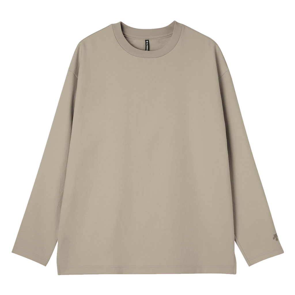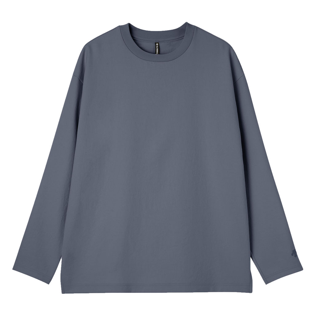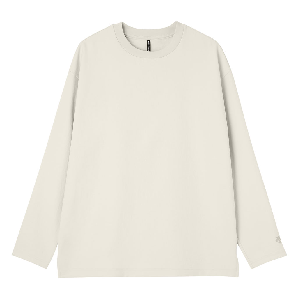 A long-sleeve T-shirt in a UV-blocking, stretch fabric. The fabric is with an easy texture and stretch and a slightly relaxed silhouette. In an antibacterial yarn it is easy to care for with home laundering. Despite its soft, sweatshirt-like comfort, it has a sophisticated appearance suitable for both business and casual settings. Ideal for wearing alone or layering under a tailored jacket.lightweight and thin but the use of matte full dull yarn prevents transparency. With excellent moisture absorption, it is comfortable for most of the year and is fine for both business and casual wear.