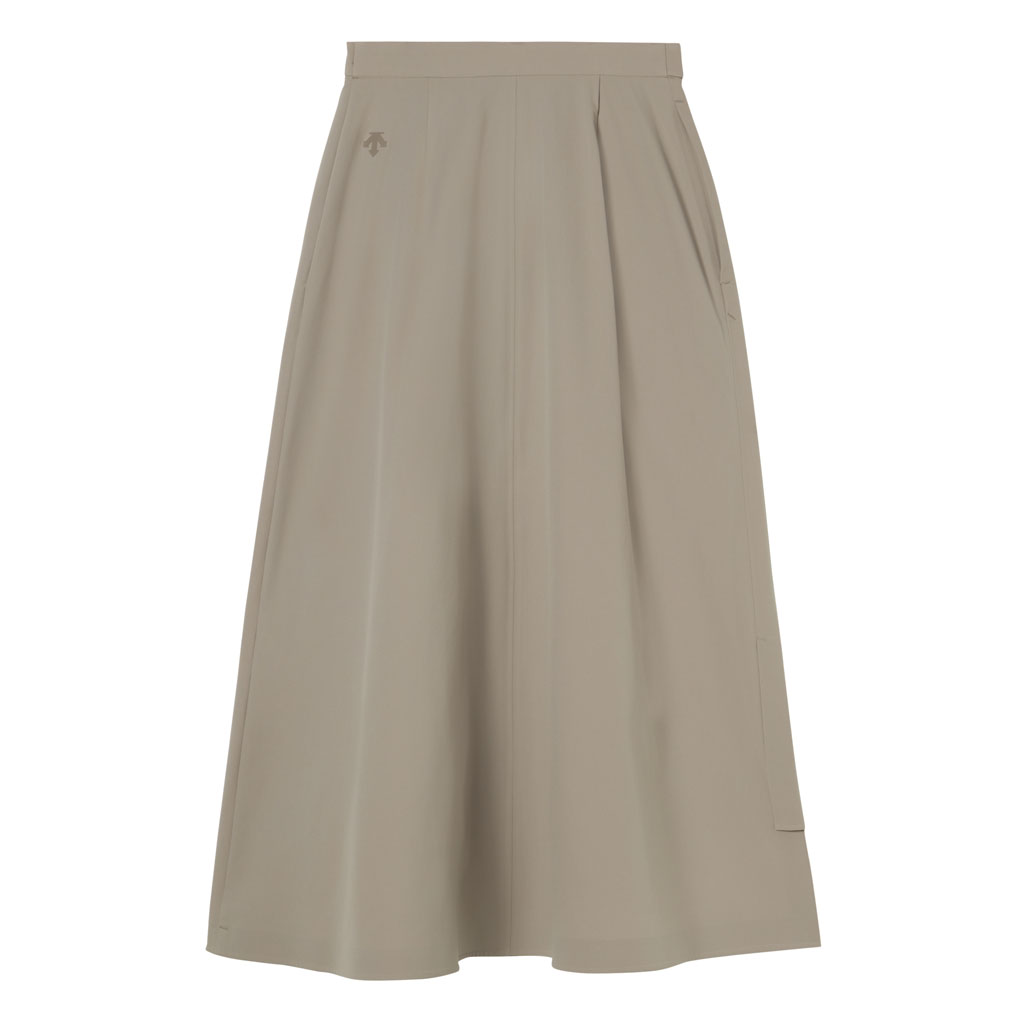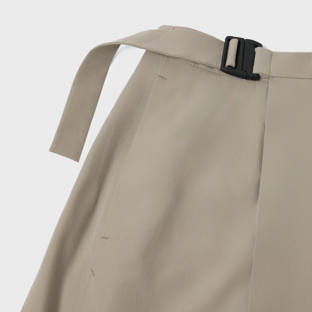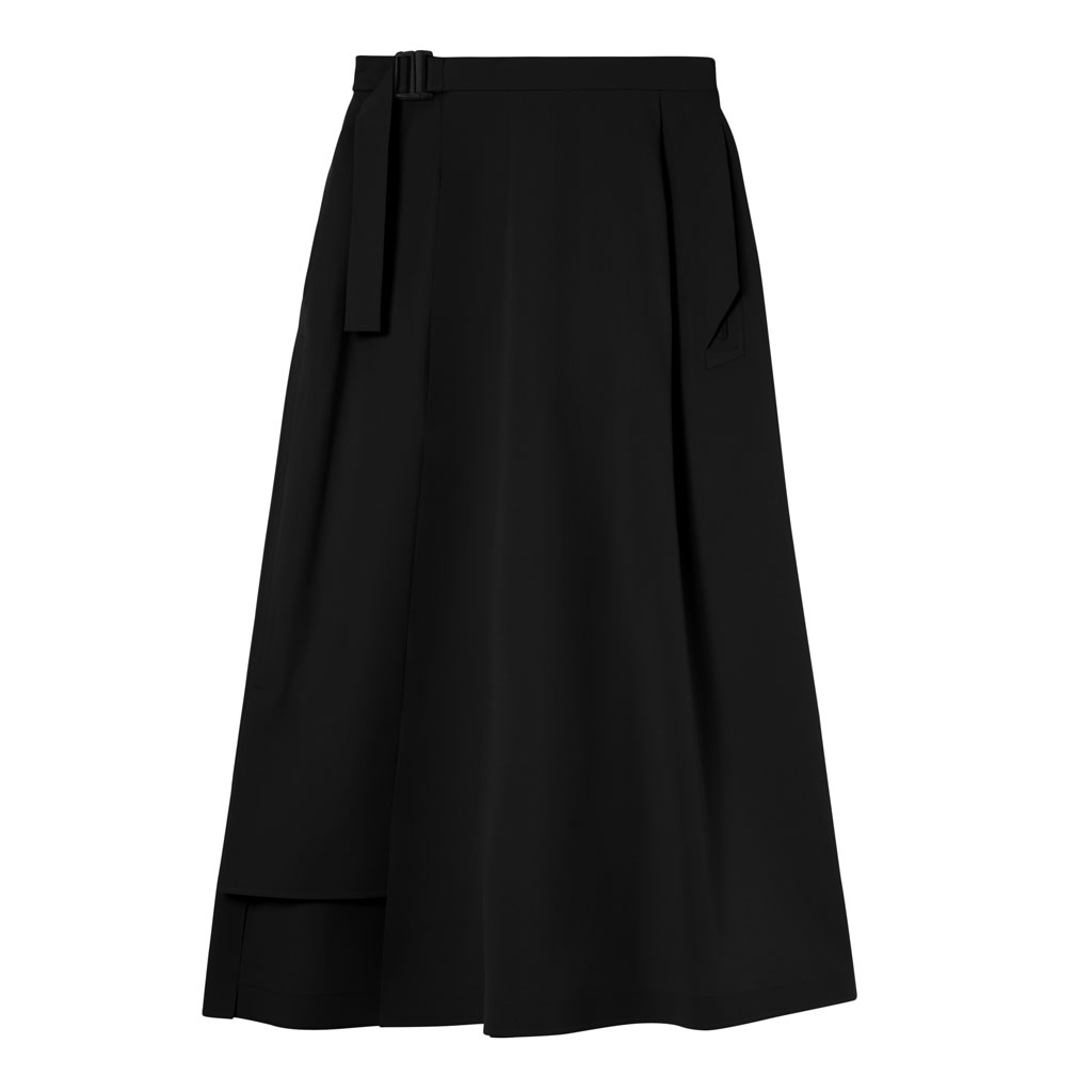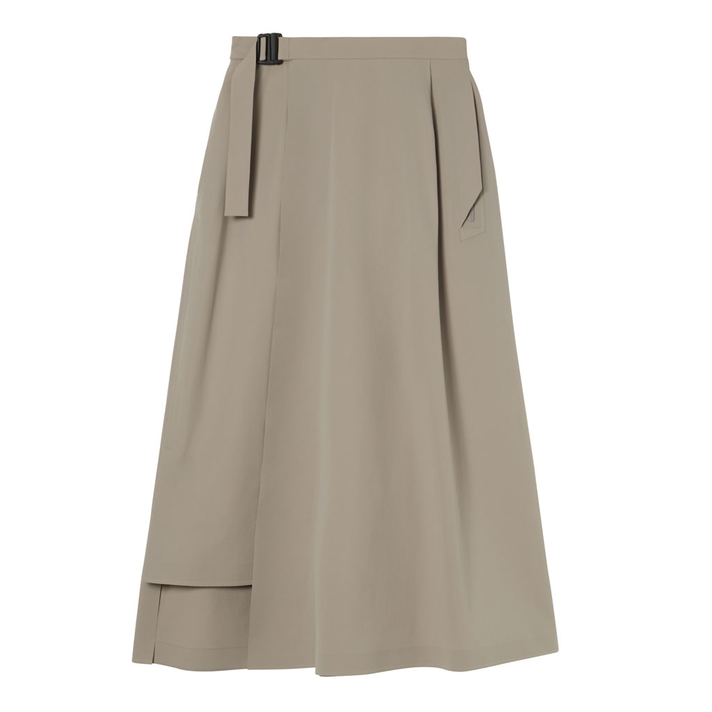 A wrap skirt with a soft texture, excellent water repellency and an A-line silhouette for a light, airy feel. The back is seamless, using a combination of ultrasonic welding and heat bonding, which maintains the fabric’s own stretch and allows a minimalist design that can be styled for business and casual wear.