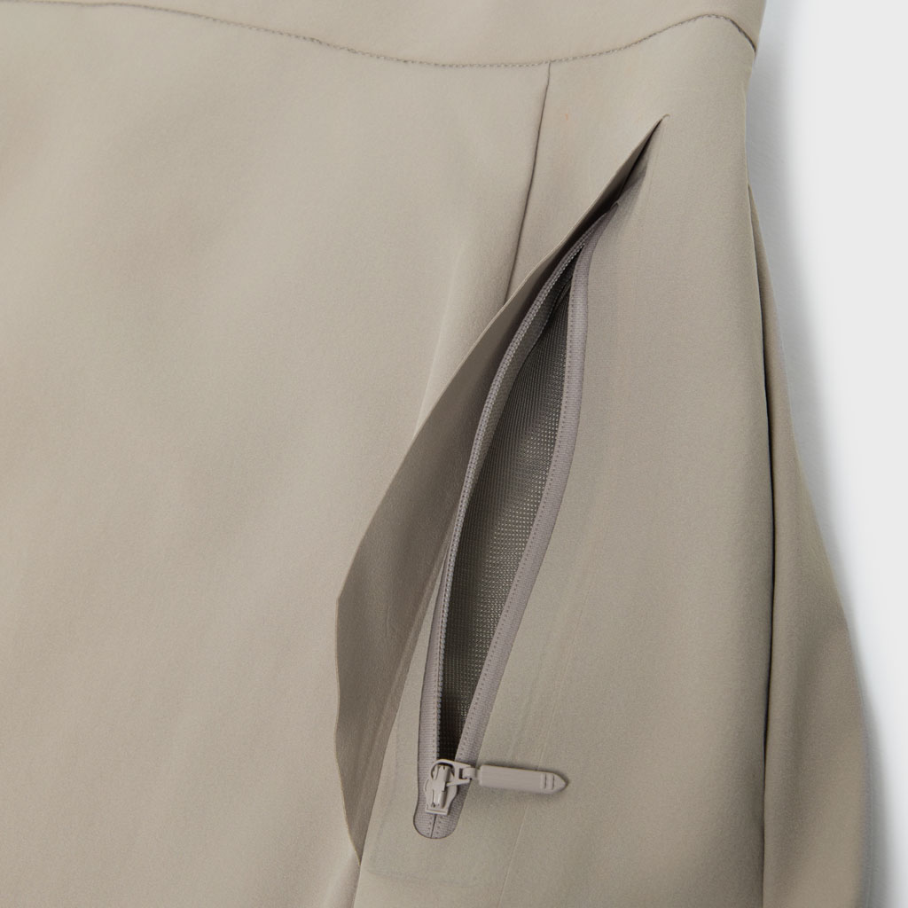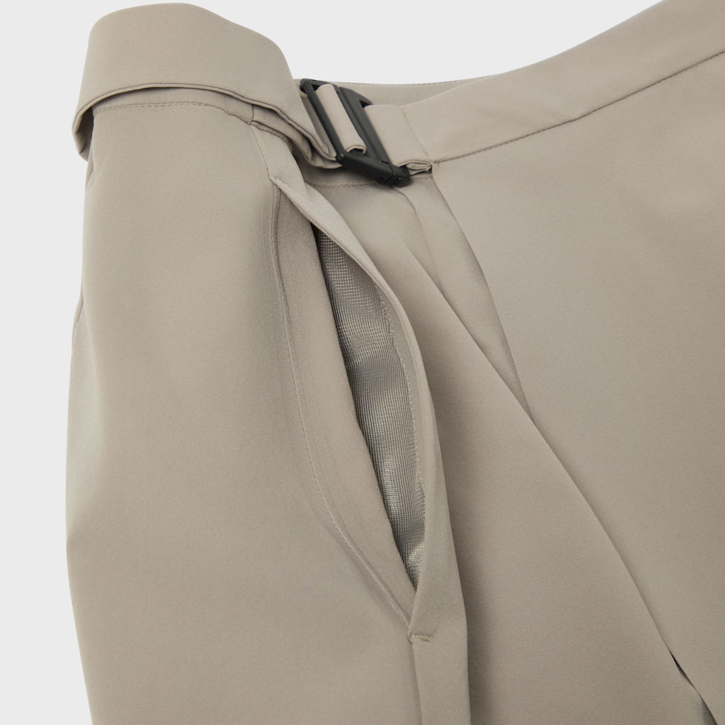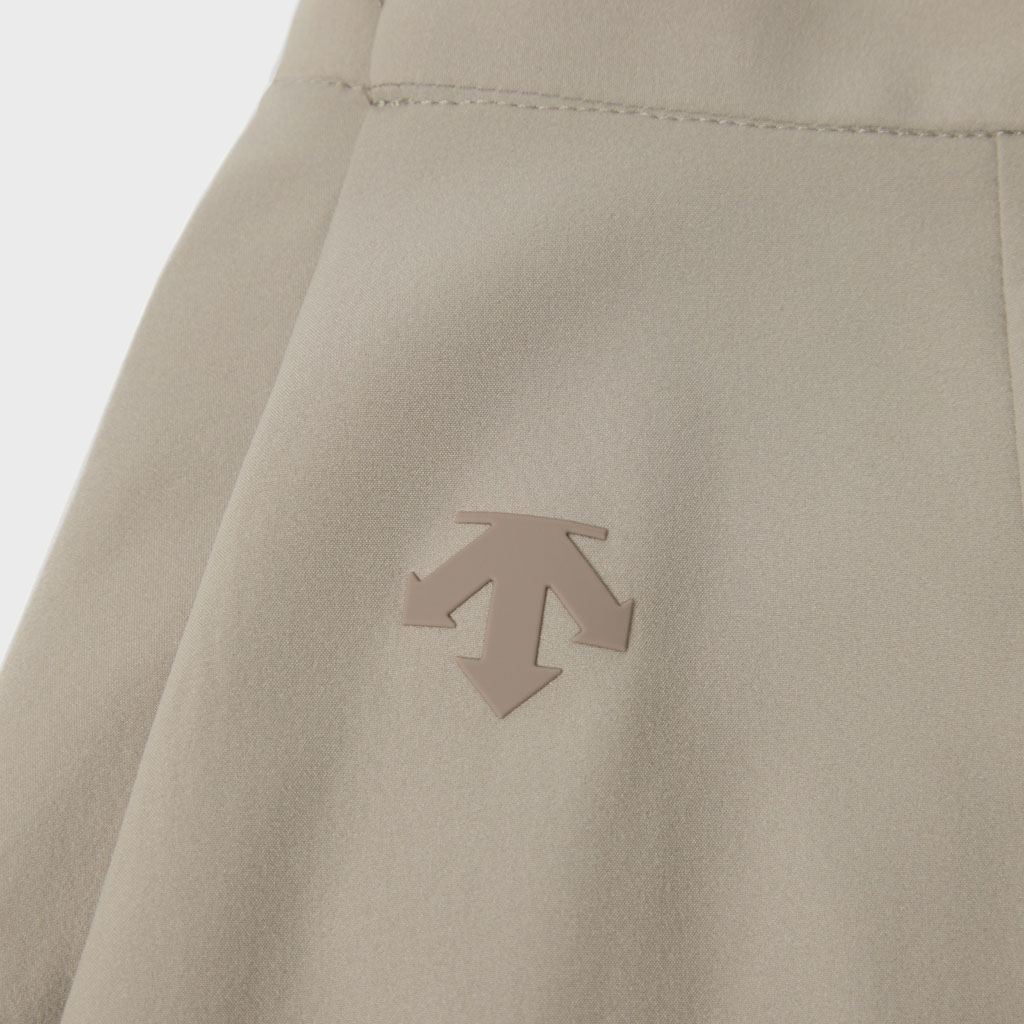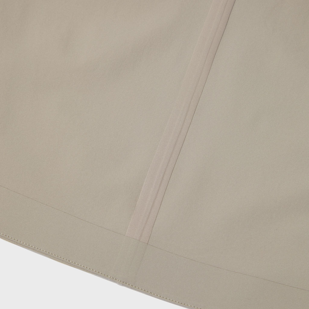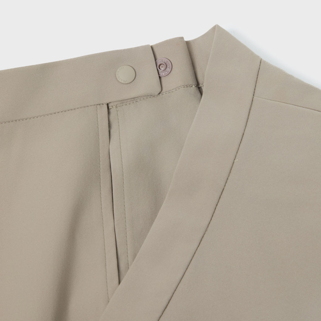 A wrap skirt with a soft texture, excellent water repellency and an A-line silhouette for a light, airy feel. The back is seamless, using a combination of ultrasonic welding and heat bonding, which maintains the fabric’s own stretch and allows a minimalist design that can be styled for business and casual wear.