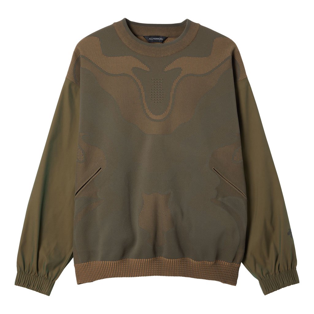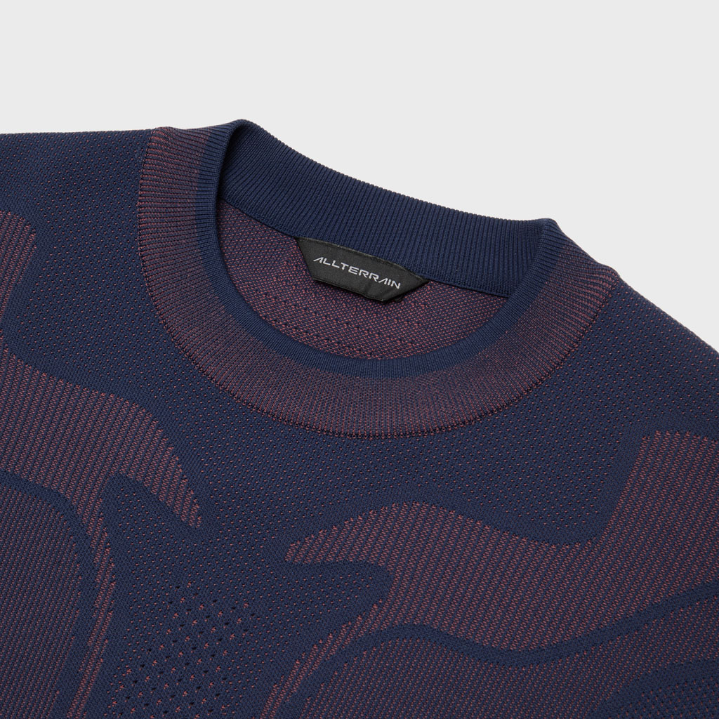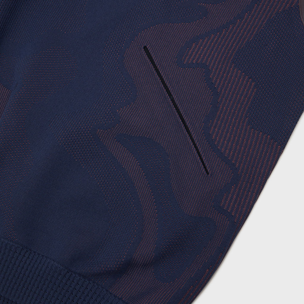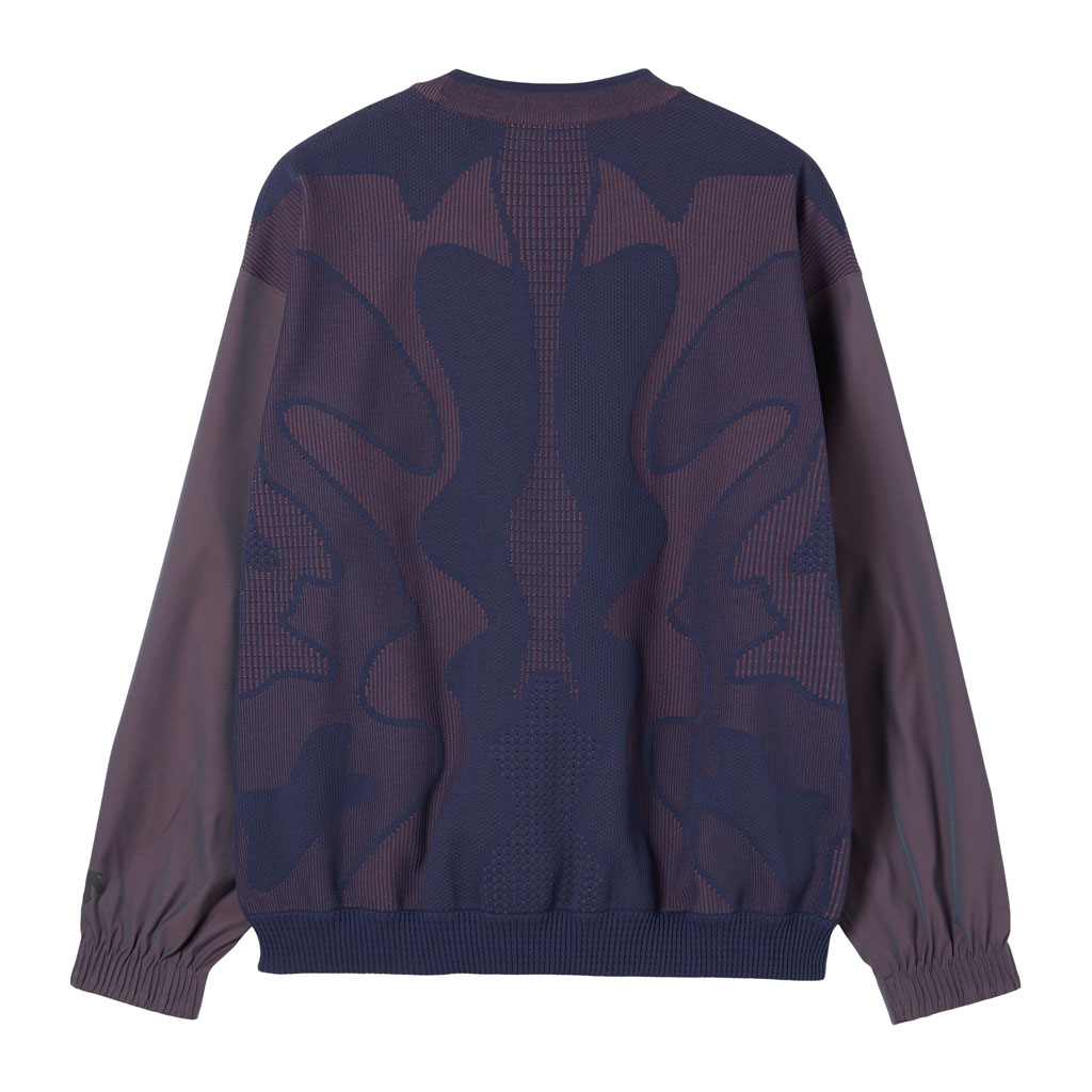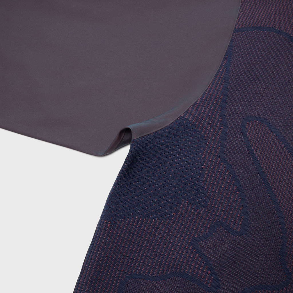 A hybrid crewneck in the Fusionknit series with a body mapping-inspired knit pattern. Various jacquard patterns are knitted into a single fabric piece for thermal comfort and seamless stretch in the front and back. The sleeves are in woven fabric for design impact and abrasion resistance. DESCENTE’s original pattern engineering creates a 3D silhouette with an enveloping fit. A combination of knit-and-sew garment manufacture, ultrasonic processing and thermal bonding creates a seamless design for maximum freedom of movement and comfort.