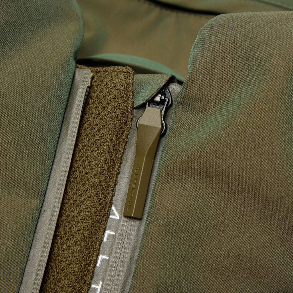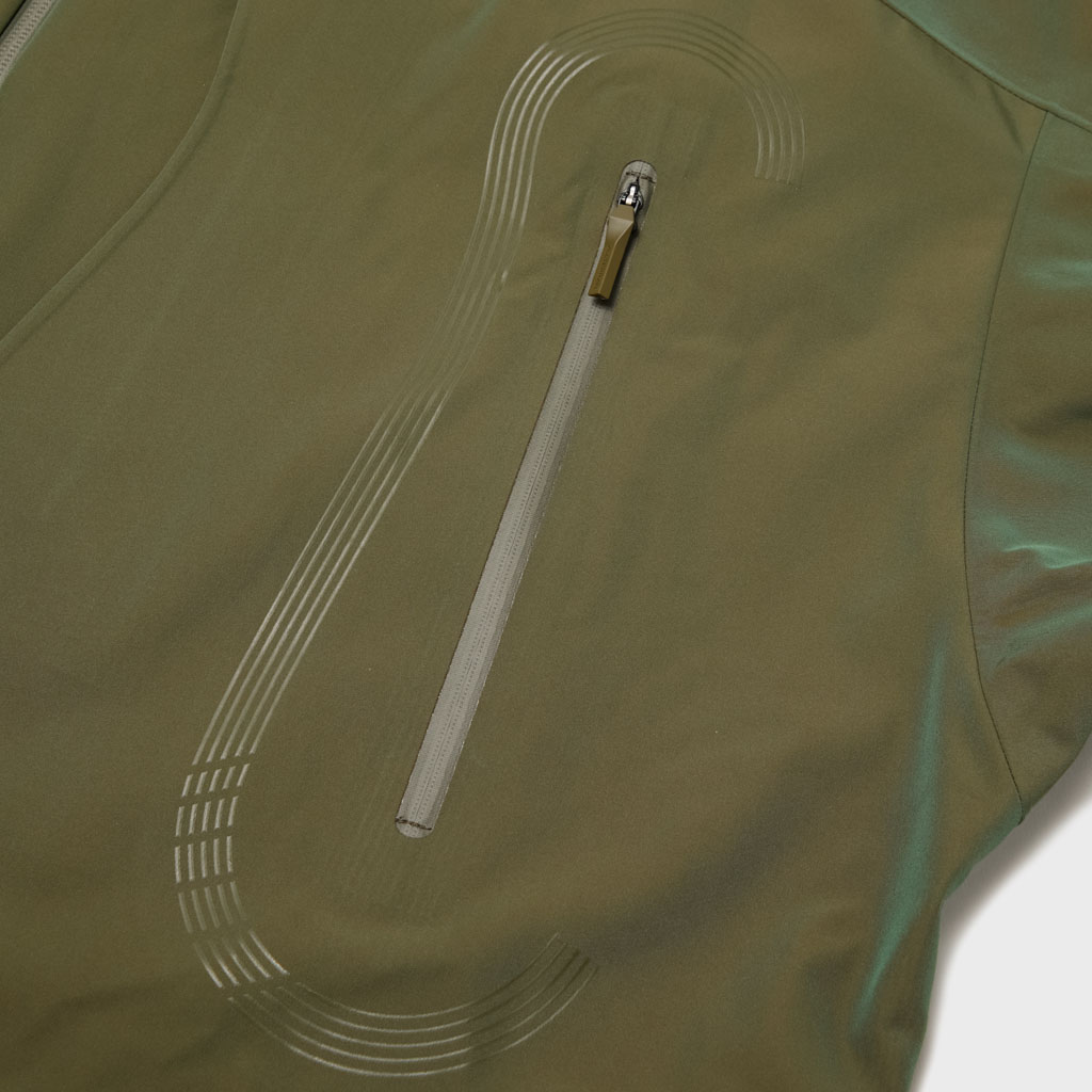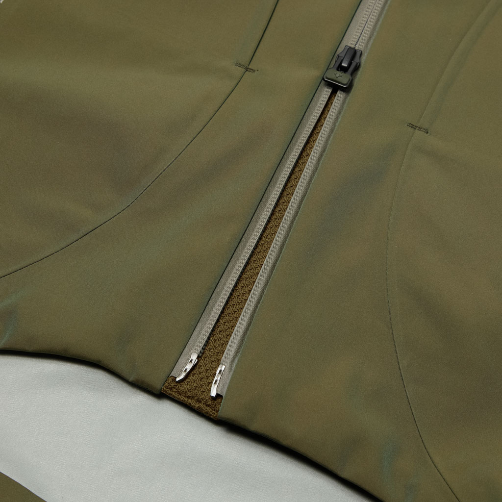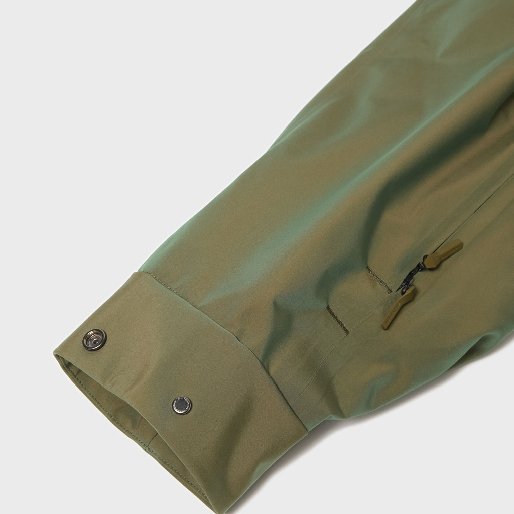 A hard shell jacket in a lustrous chambray fabric, engineered with superior waterproofing and breathability. It has a dynamic color tone that changes with movement, giving it visual depth. The short overall length and voluminous body and sleeves give it a rounded, 3D silhouette allowing better air circulation. Airflow is further enhanced by ventilation zippers on the back of the sleeves. When opened, internal pleats with laser-cut holes expand, releasing heat through the widened sleeves. DESCENTE’s unique Dual Ventilation System is used in the front. Two rows of zippers with mesh between them bring in outside air to promote active ventilation. In wet weather the Parahood System prevents water from pooling in the hood and Streamline Technology channels water away from chest pockets. Snap buttons at the cuffs and the Cohaesive® system at the hem allow silhouette adjustment to offer styling options. The rain jacket reimagined.